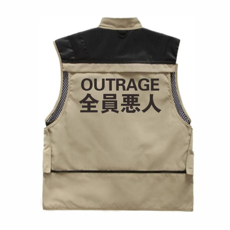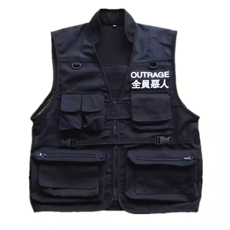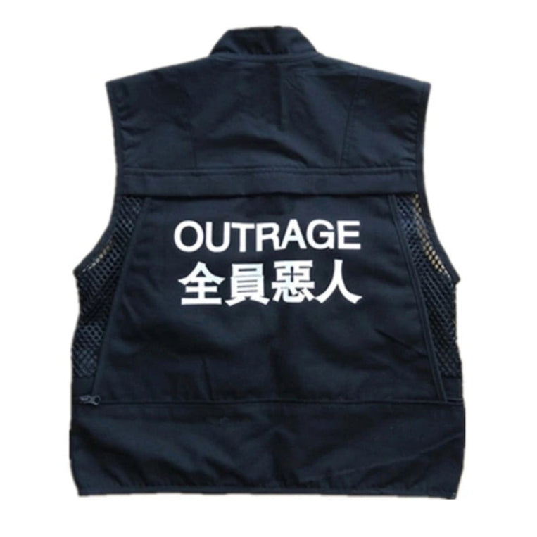 Built from durable high quality cotton with a full lining, this vest delivers a street-tactical look with real edge. Multiple flap, zip, and mesh pockets bring utility to the front, while bold Japanese text (全員悪人 – “Everyone’s a villain”) adds underground attitude. Finished with a front zip and adjustable buckle strap for a secure, layered fit.