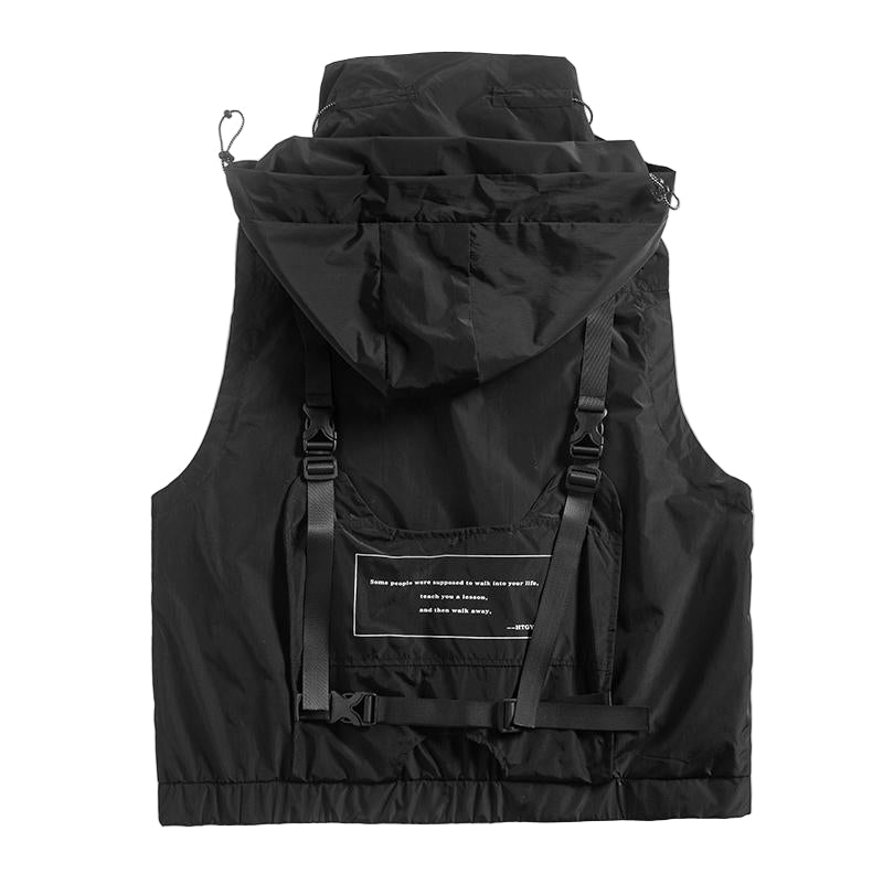 Dual buckle straps define the front, adding utility without overloading the design. The body stays relaxed for easy layering, and the elastic hem brings a controlled finish. From the back, the reinforced strap detail and centered text patch add depth while keeping the aesthetic minimal and modern.