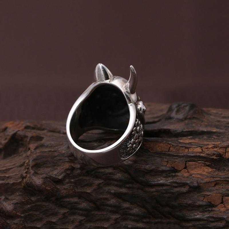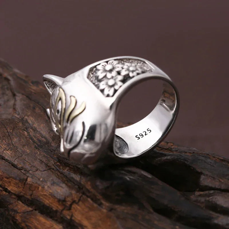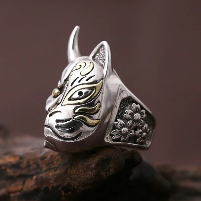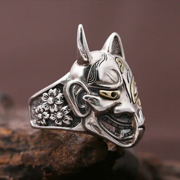 Crafted from solid 925 silver, this ring features a precise split mask design that blends Hannya and Kitsune into a single form.