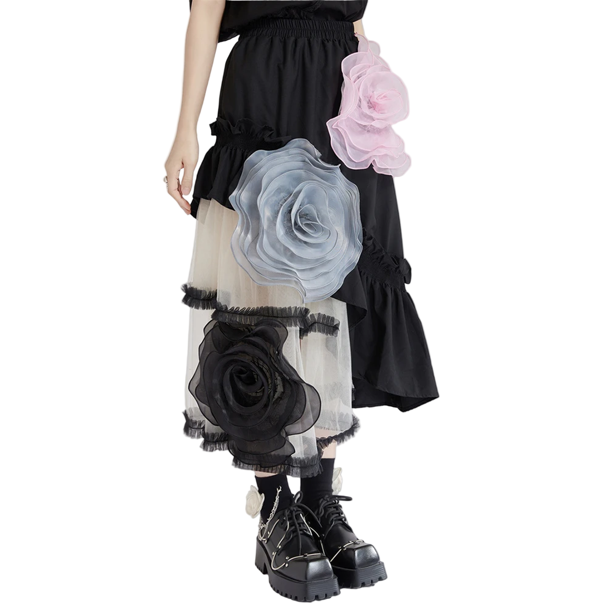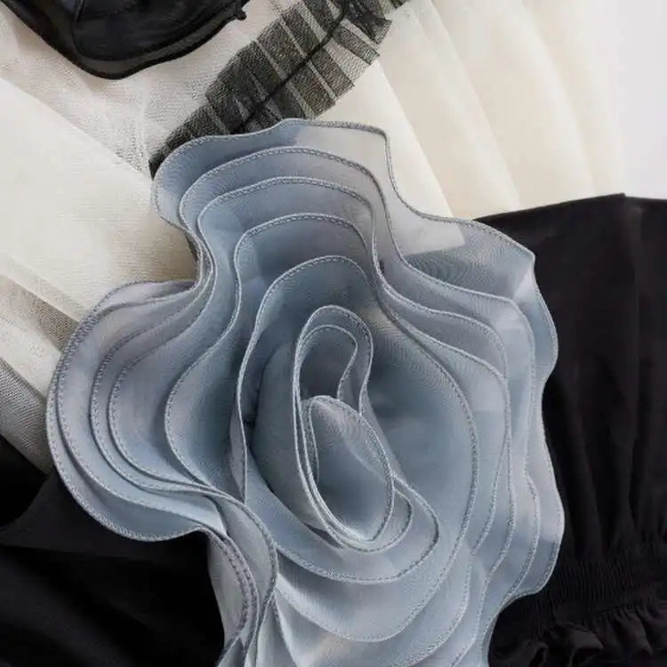 Across the body, three oversized organza rosettes bloom in tonal contrast: blush pink at the waist, soft grey at the thigh, and deep black at the hem. Their concentric, rolled-edge petals create architectural dimension, floral motifs expanded into scale.