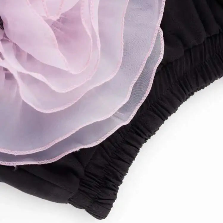 Florals: Oversized sculpted organza rosettes in blush pink, grey, and black with rolled-edge petals.
