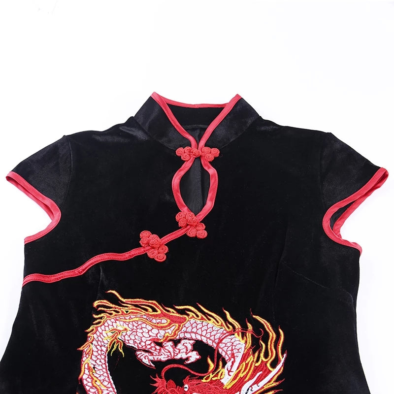 Bold and elegant, this high-waisted black Qipao showcases vibrant red dragon embroidery that commands attention. Crafted from a soft cotton-acrylic blend, it features a classic stand collar and short sleeves, perfectly balancing tradition and modern style.