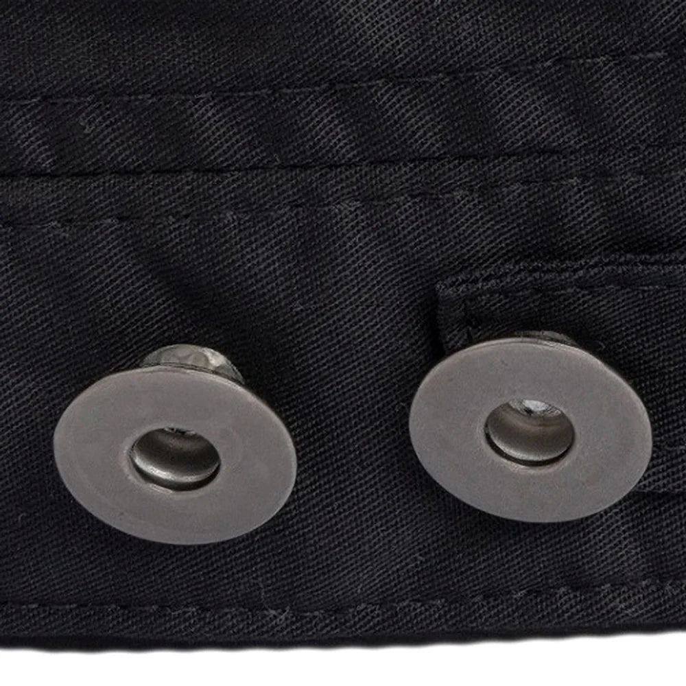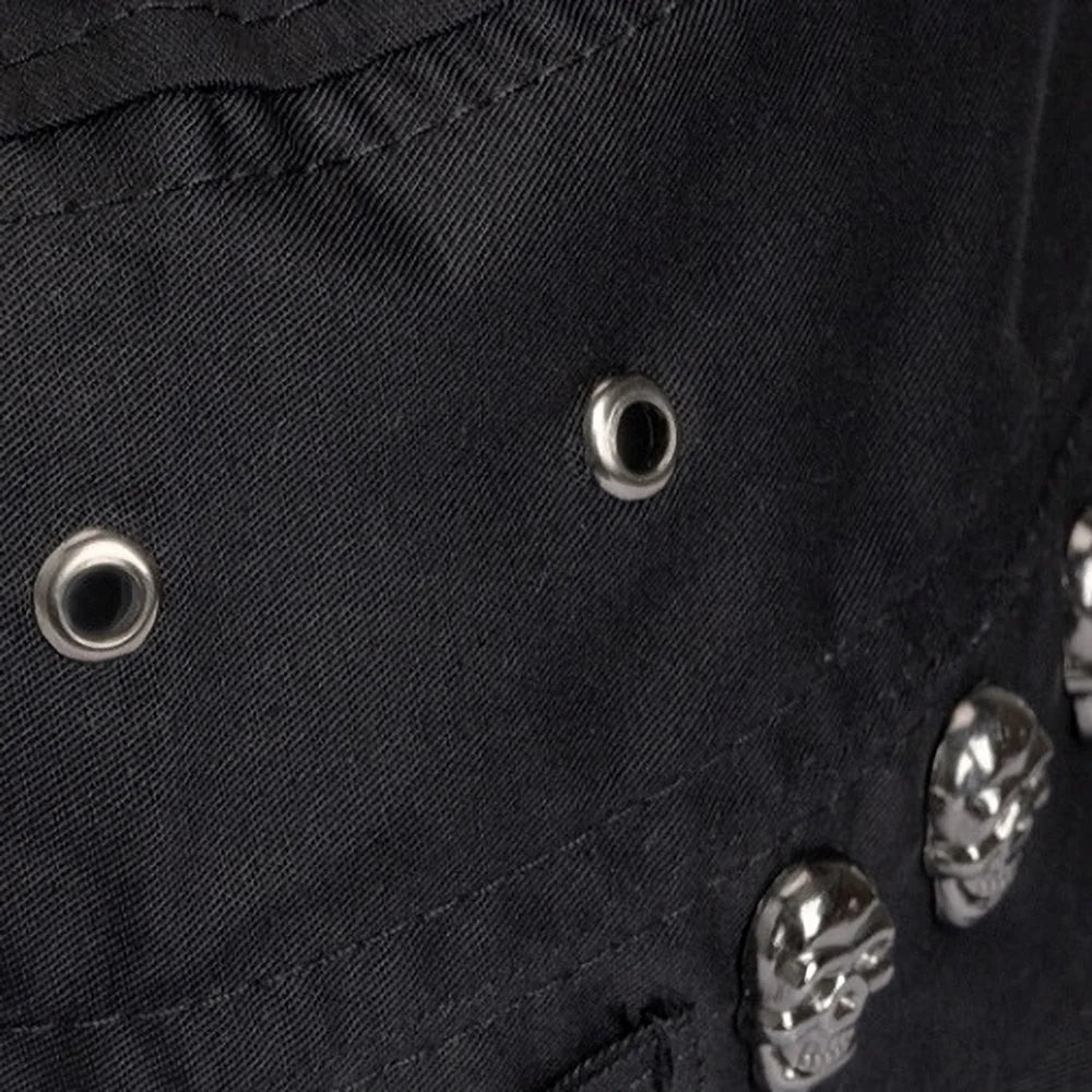 Silver polished skull studs run in a straight line along the crown band, then repeat across the brim for a layered metal hit that stays clean. Paired metal eyelets sit on the side panels for ventilation, and the fit adjusts with side snap tabs finished with oversized matte disc hardware.