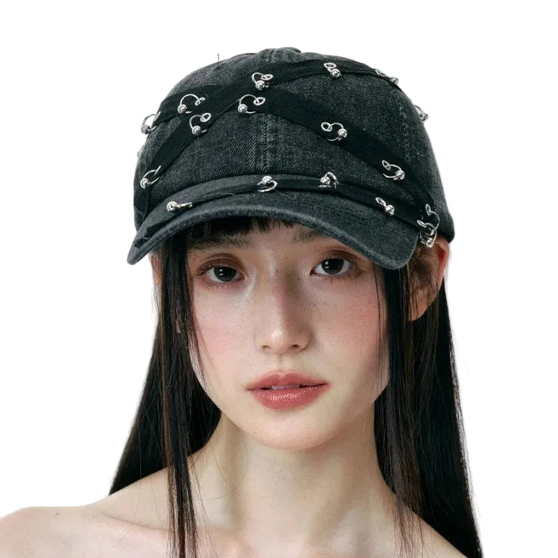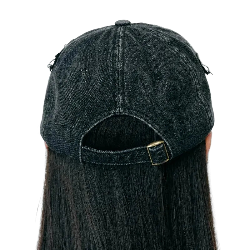 A washed black denim cap finished with layered black webbing straps that wrap the crown and run across the brim. The denim has a charcoal washed depth with a clear twill grain, giving the surface a worn in richness without looking distressed.