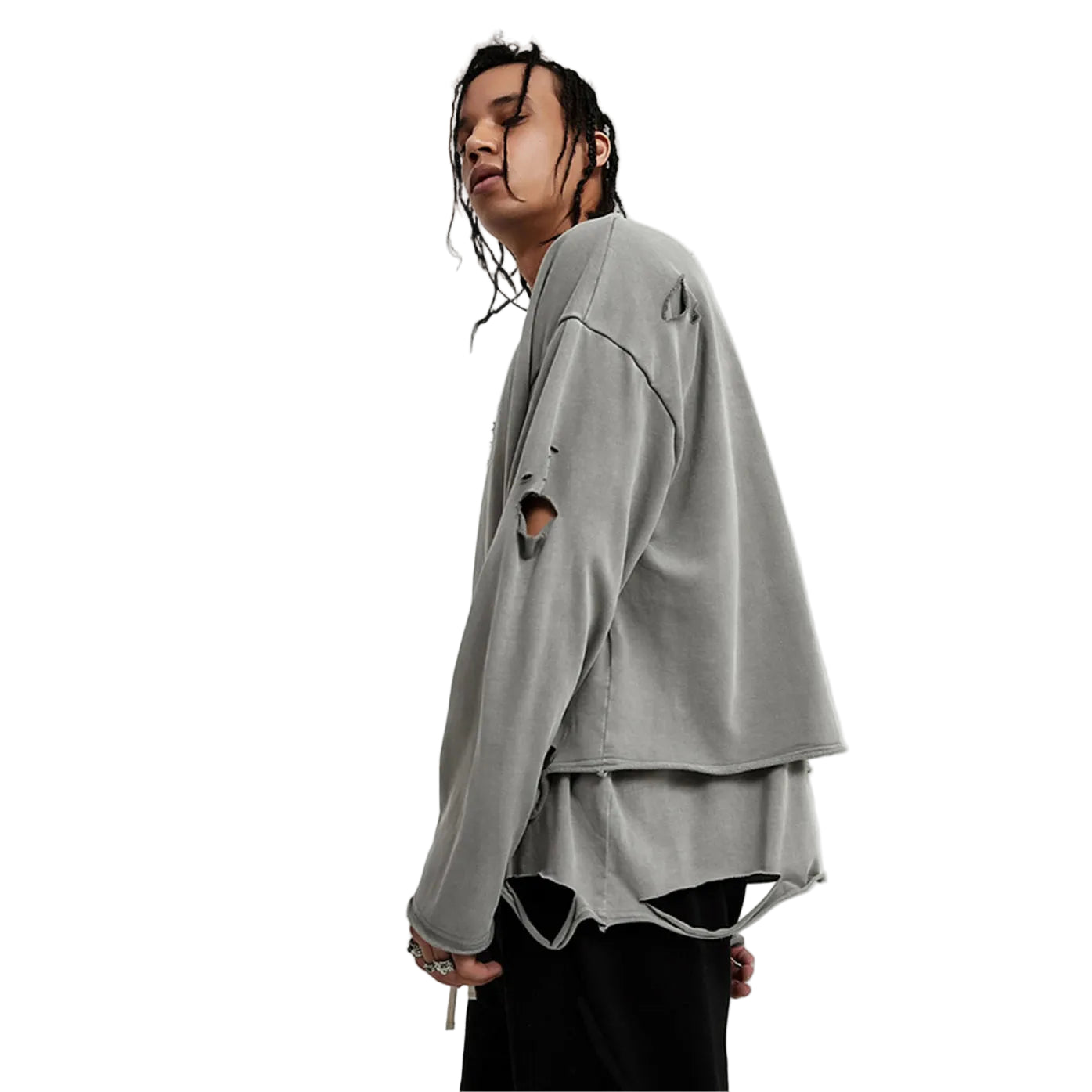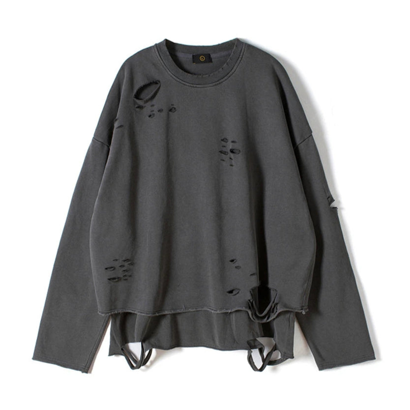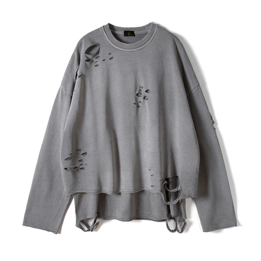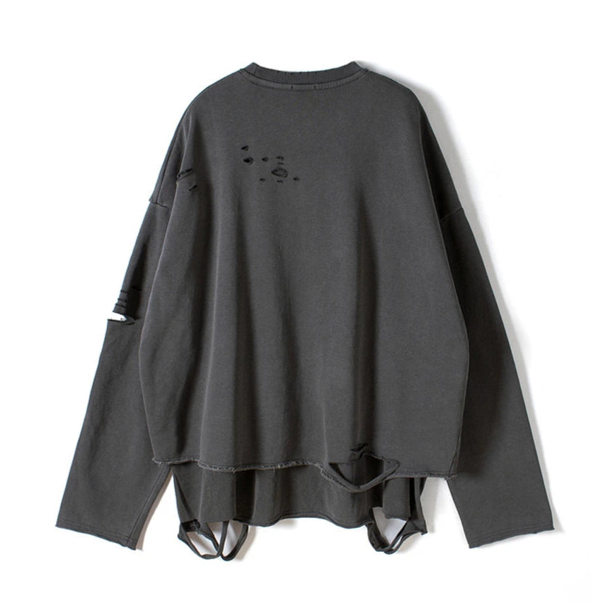 Distressed from every angle without sacrificing structure, this oversized sweatshirt blends raw streetwear energy with a brutalist finish.