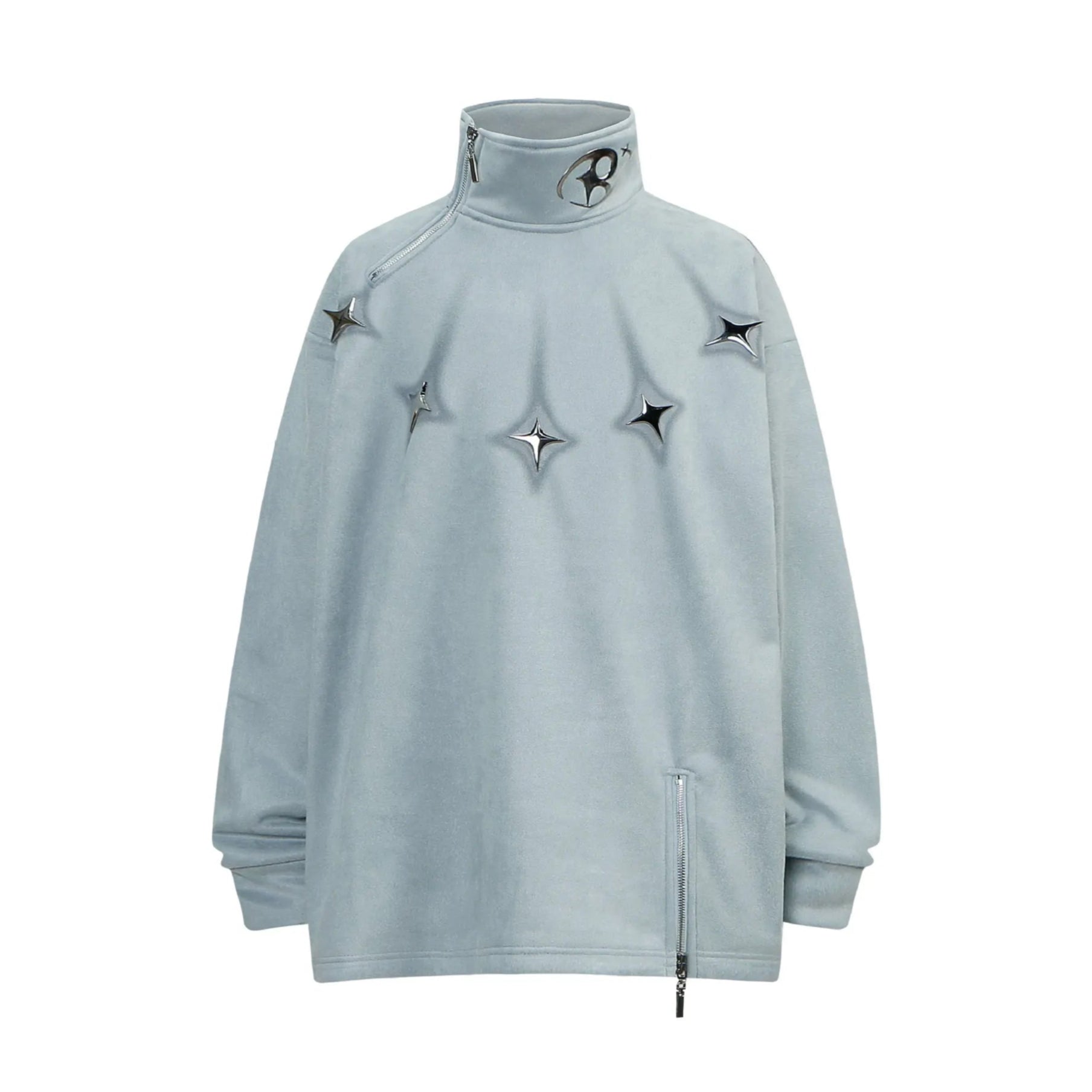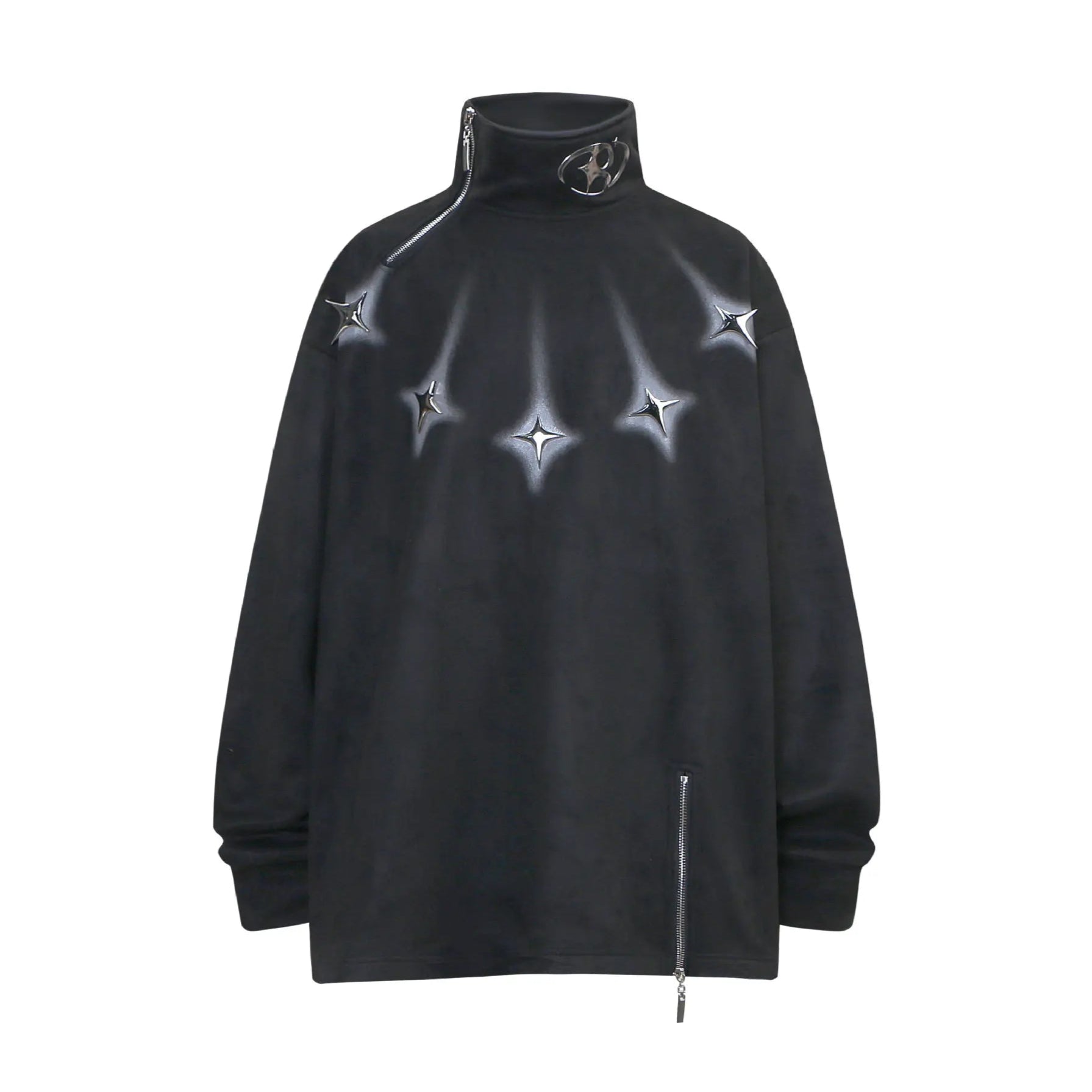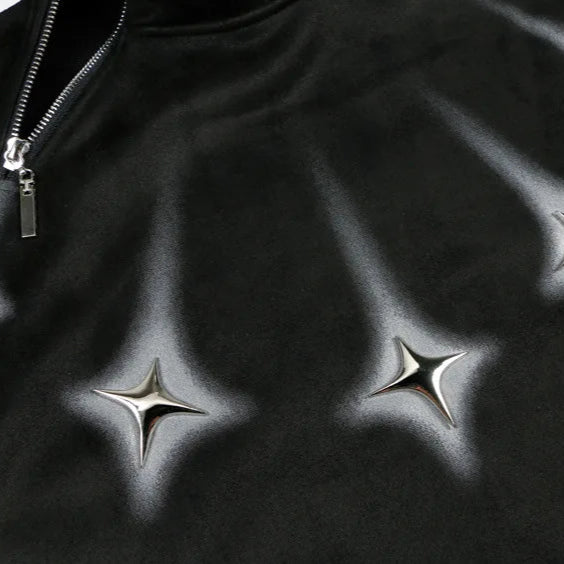 The asymmetrical zip collar and hem break symmetry with controlled intensity, while star shaped metallic appliqués across the chest and neck glow like artificial constellations, metallic, dimensional, and deliberately cold.