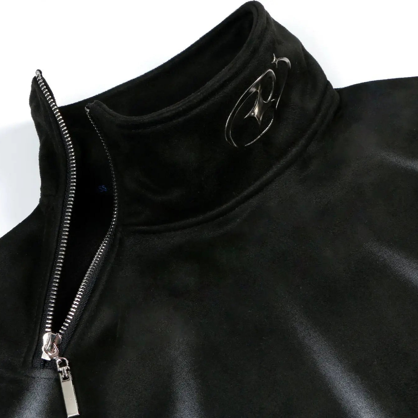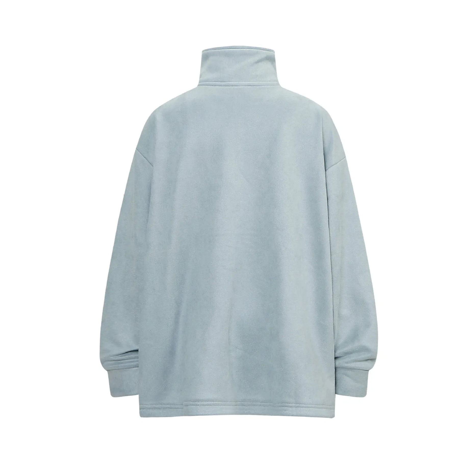 A futuristic silhouette grounded in warmth and tactile presence. This oversized mock-neck pullover is built from heavyweight velour-backed fleece with a matte suede finish, exceptionally soft to the touch yet structured enough to maintain its shape.