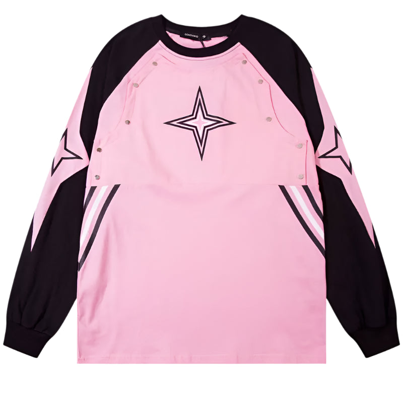 Built with a galactic edge, this sweatshirt features a bold star emblem across the chest and mirrored arrow graphics running down each sleeve, creating a sharp and directional silhouette.