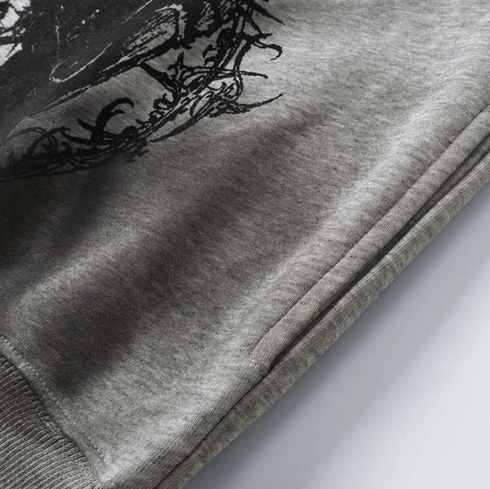 Built from heavyweight fleece-back cotton with a dry, structured surface, this zip hoodie layers baroque anime graphics over a cloud-faded shell. The pigment-washed body creates a smokelike tonal shift through the arms, hood, and hem.
