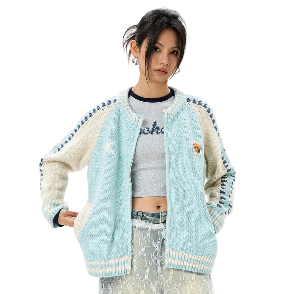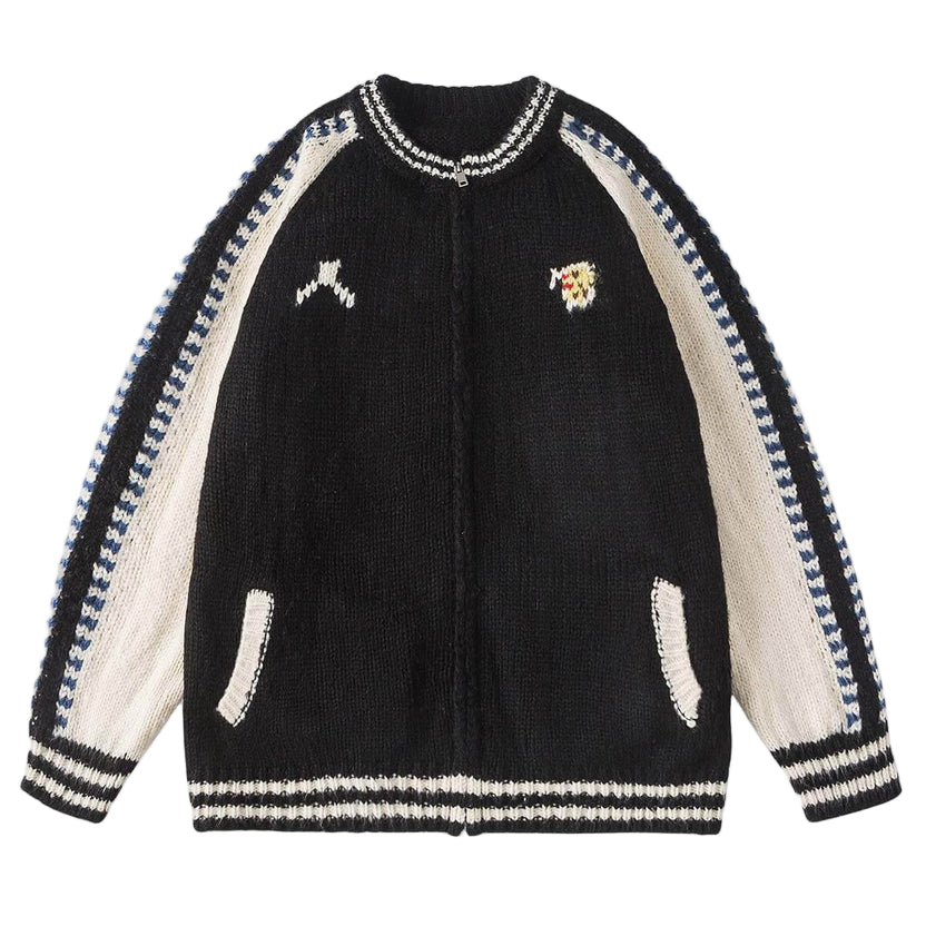 A knit zip jacket built on texture, structure, and contrast. The body is rendered in a dense chunky-gauge knit with sculptural loft, anchored by rib trims at the collar, cuffs, and hem for lasting shape.