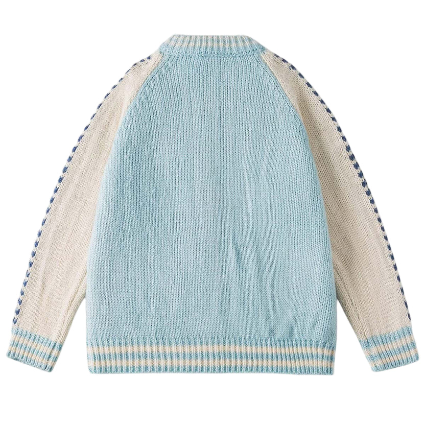 Set-in sleeves carry a bold knitted check pattern down the arms, giving movement and dimension to the silhouette. Integrated welt knit pockets emerge cleanly from the body, while two embroidered chest emblems, one minimal, one multicolor, add a crafted layer of identity.