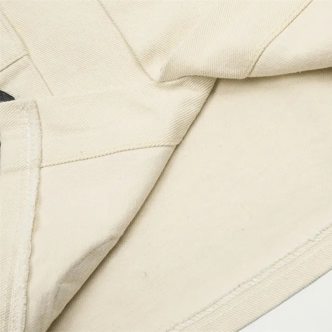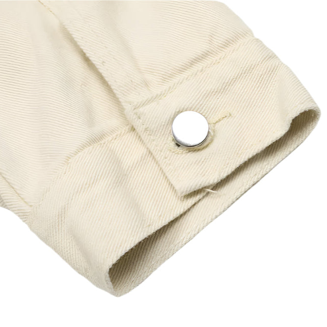 Crafted from light beige cotton canvas with a dense diagonal weave, this Archive Jacket merges clean workwear structure with the curated edge of an art piece. The fabric holds its shape with a crisp, medium-weight drape, making it ideal as a statement outer layer.