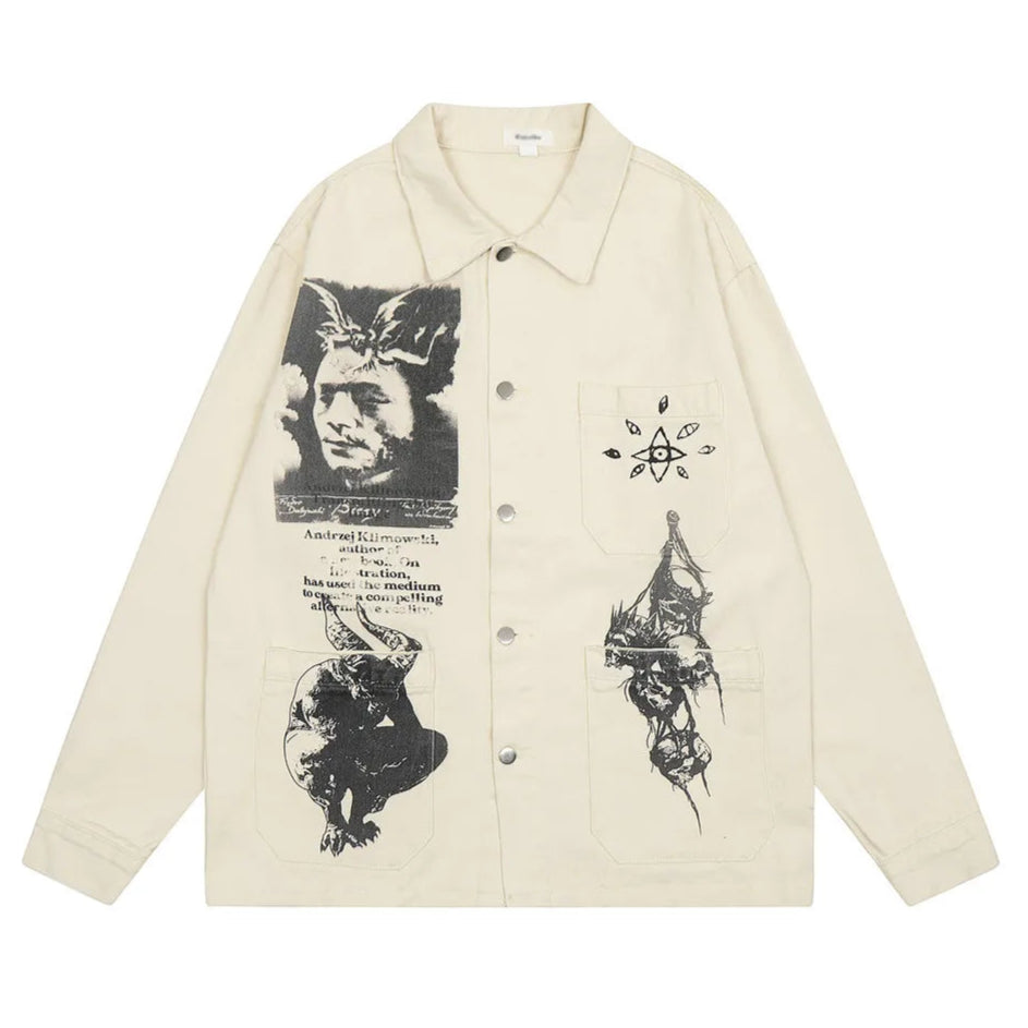 Across the front, monochrome prints are arranged like pages from a private collection: a halftone portrait with diffused edges over serif review text, a circular sigil stamped on the chest pocket, a crouched horned figure on the left lower pocket, and a vertical reliquary of thorn-crowned skulls on the right. Each element is intentionally placed to overlap seams and pockets, creating a layered, archival composition.