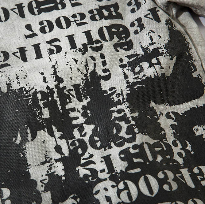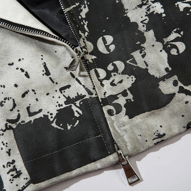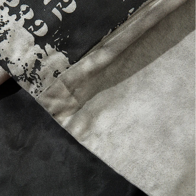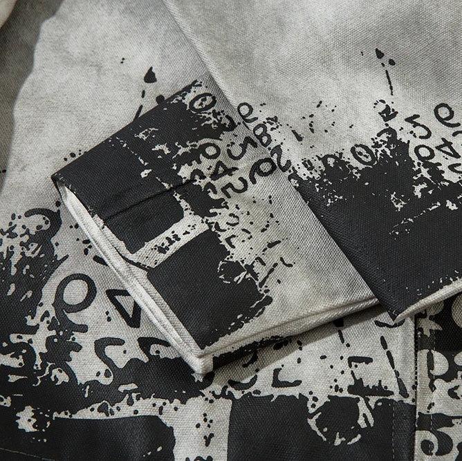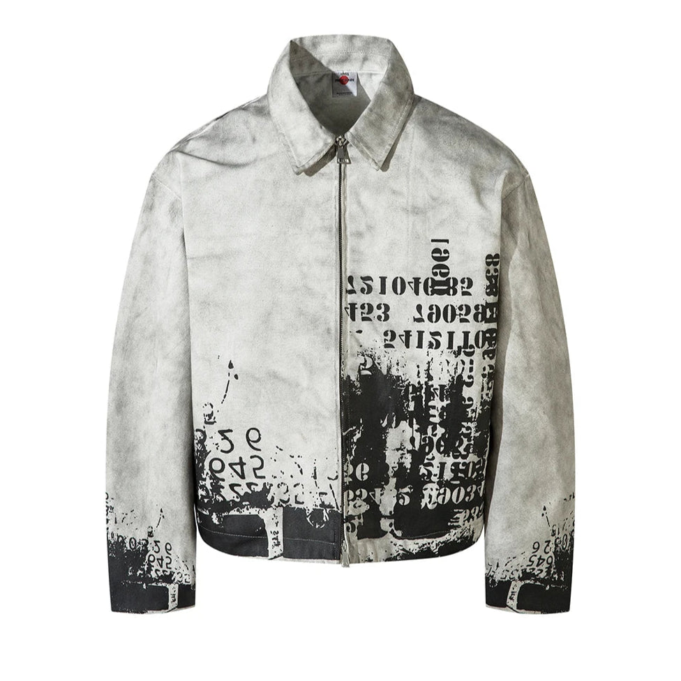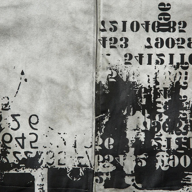 Built with a focus on structure and concept, this jacket merges dystopian tones with clean construction. The outer layer features a faded concrete wash that feels both archival and futuristic. Randomized number prints and stenciled typography wrap the front and sleeves in worn, utilitarian chaos, while the back carries a stitched phrase "Suffering is the teacher of life. Through suffering towards joy".