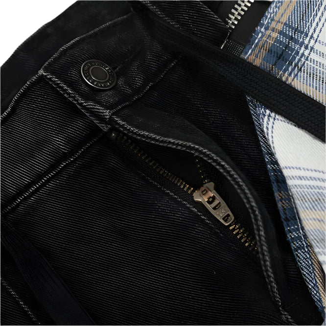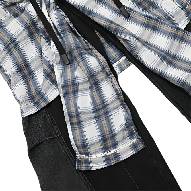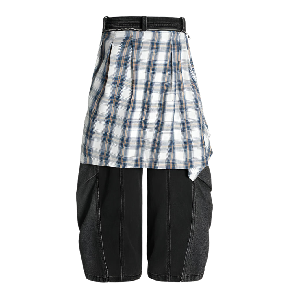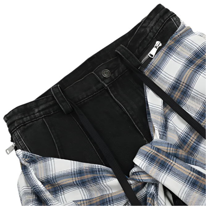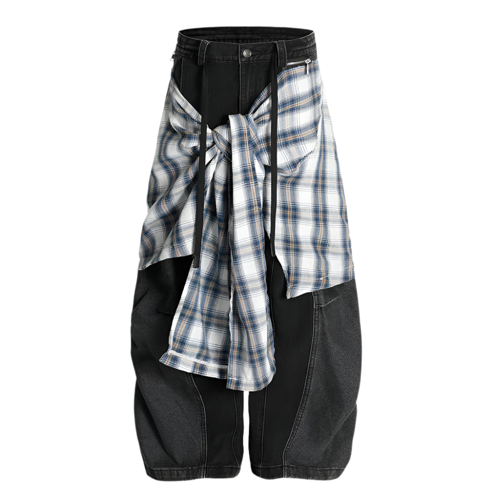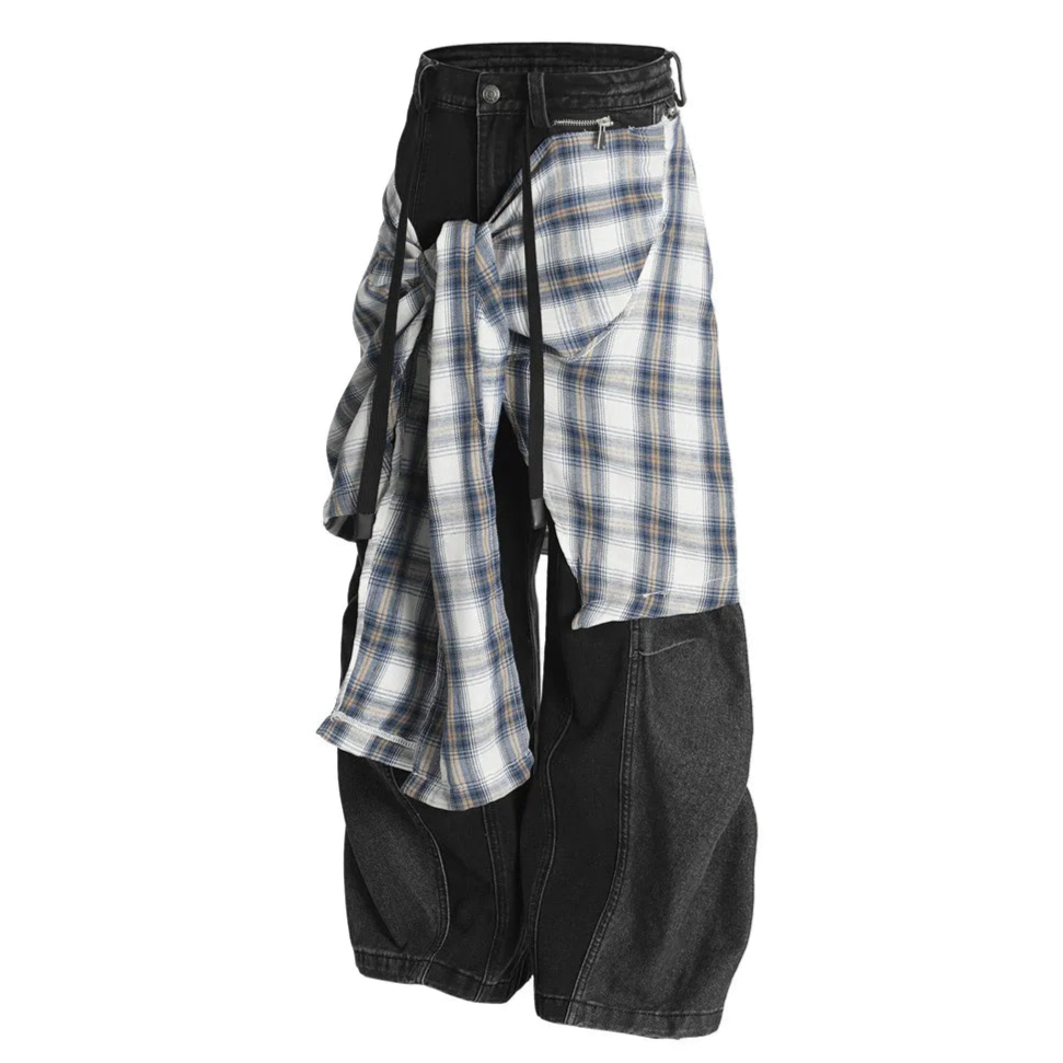 This statement piece combines structured denim with an attached plaid overshirt panel that drapes naturally and detaches through a concealed back zipper. The denim base is subtly spliced with contrasting black and gray panels stitched into a relaxed, baggy cut.