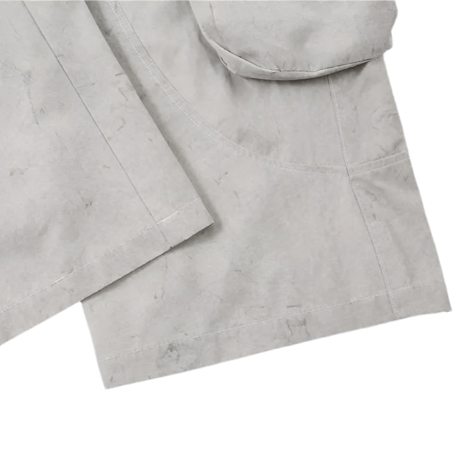 The fabric is tightly woven to hold its shape yet soft enough for daily wear, providing structure without stiffness. Snap and zip closures, reinforced topstitching, and a tonal leather patch at the back waistband complete the precise industrial finish.