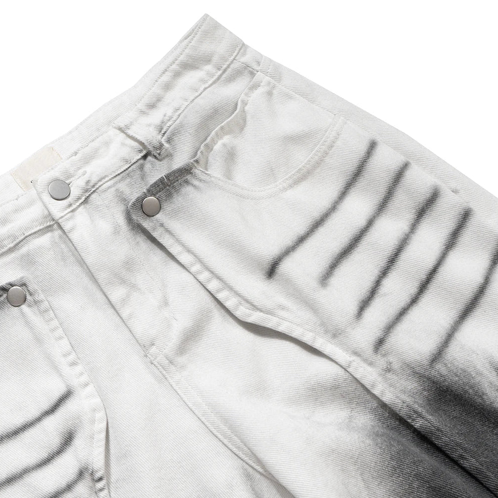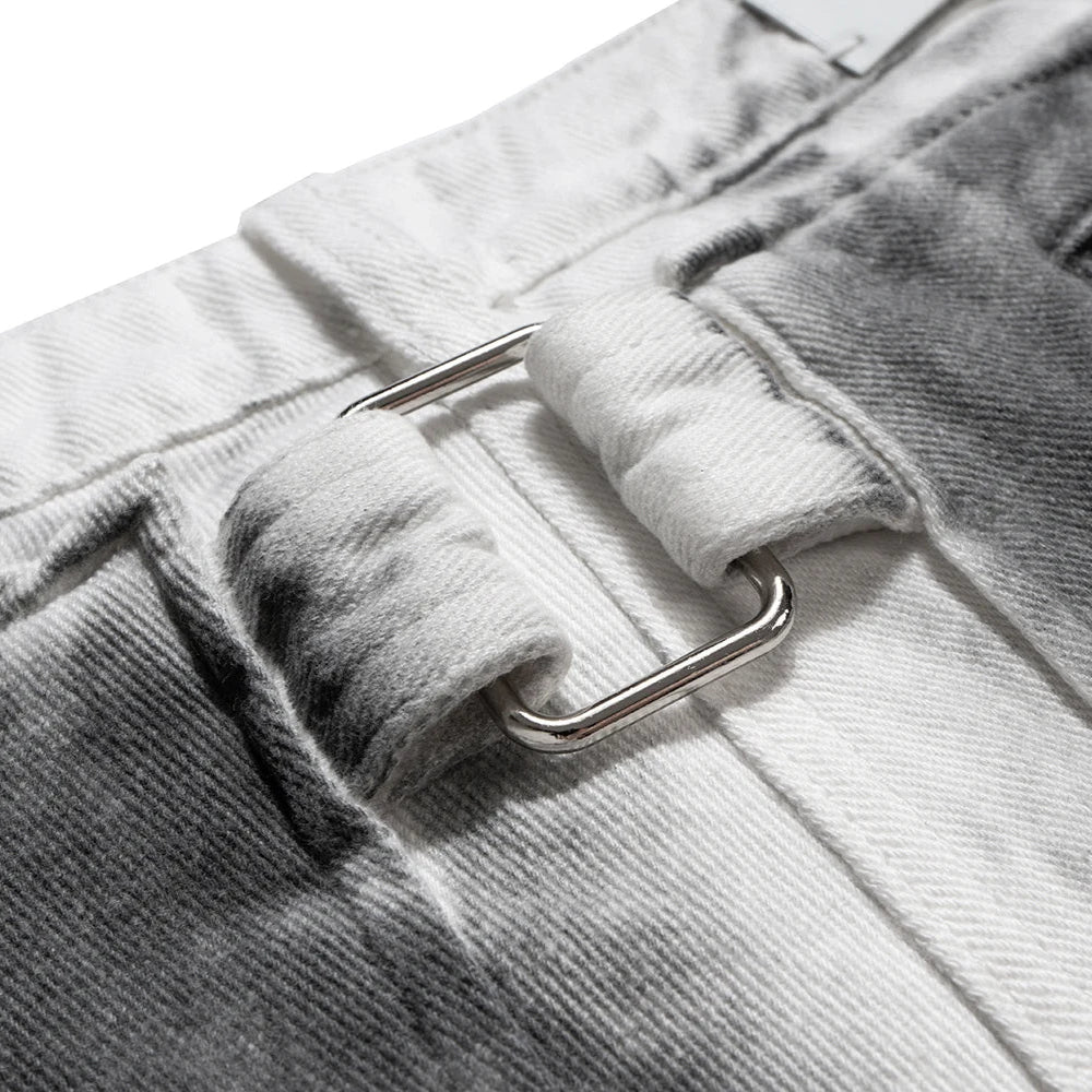 Crafted from heavyweight denim, this wide leg silhouette is built with an extended length that allows the fabric to stack naturally. A smooth fade moves from deep washed black to a soft pale grey, almost white, creating a light drenched contrast that feels clean and unpredictable.