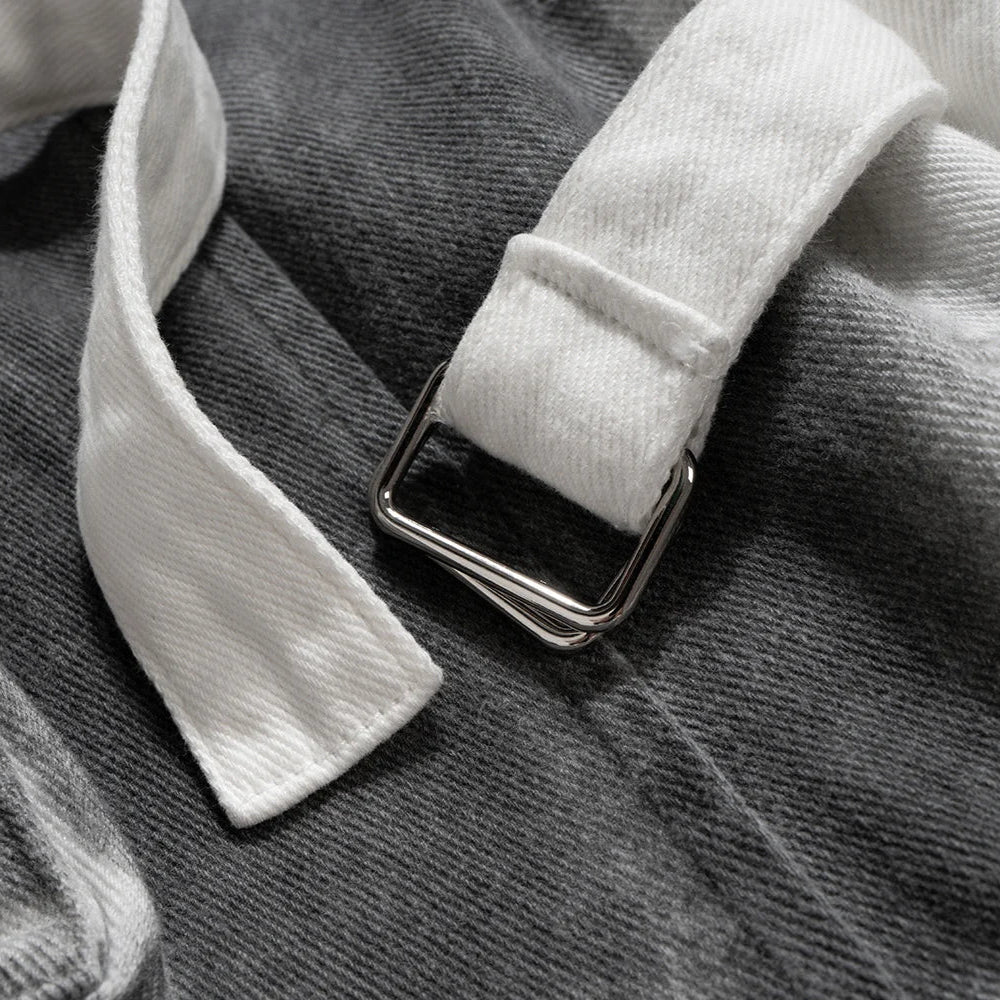 The front includes ribbed thigh paneling and dual cargo pockets, with adjustable buckle straps wrapping around the knees to add structure and attitude. The long relaxed cut gives the legs extra volume and flow, holding a strong shape without stiffness.