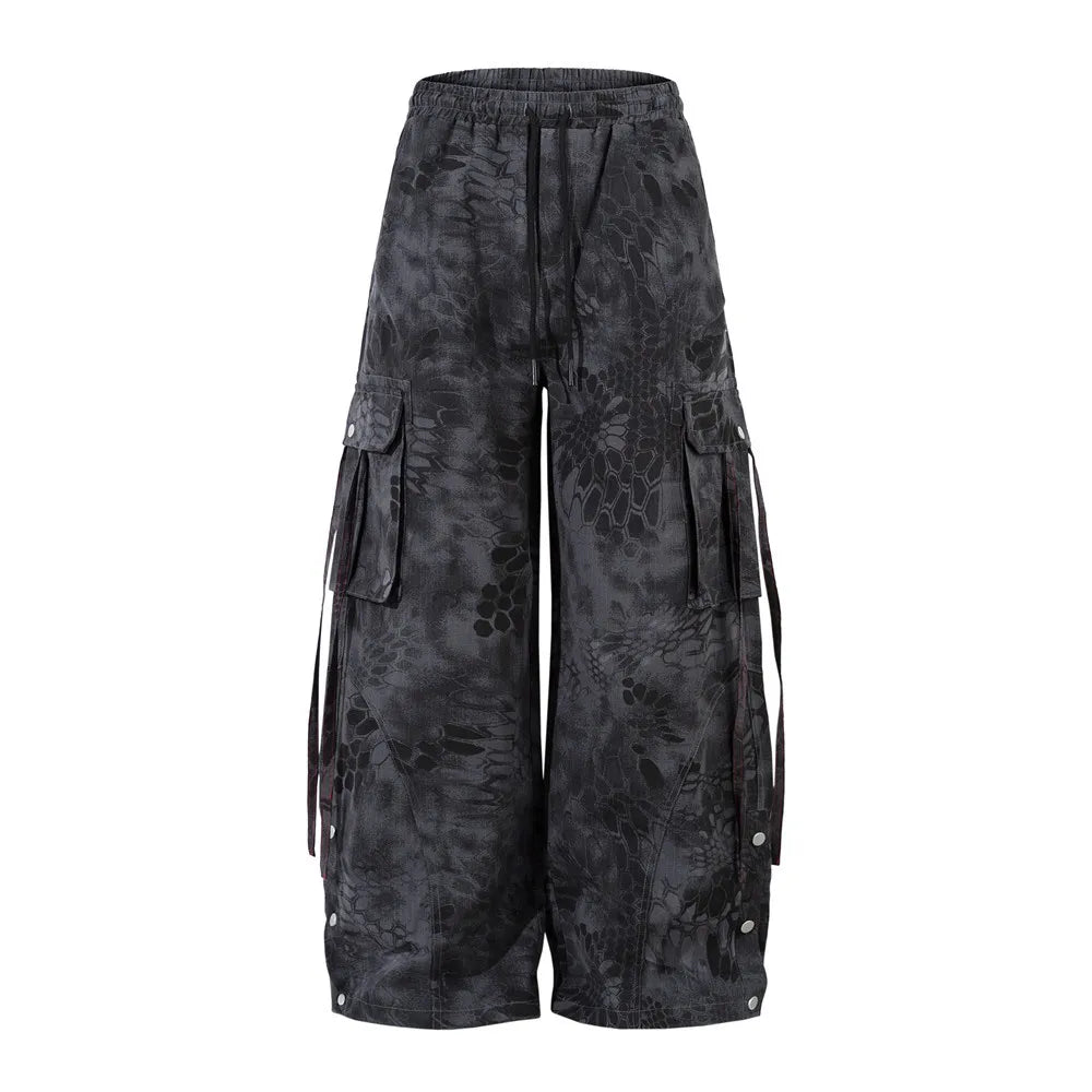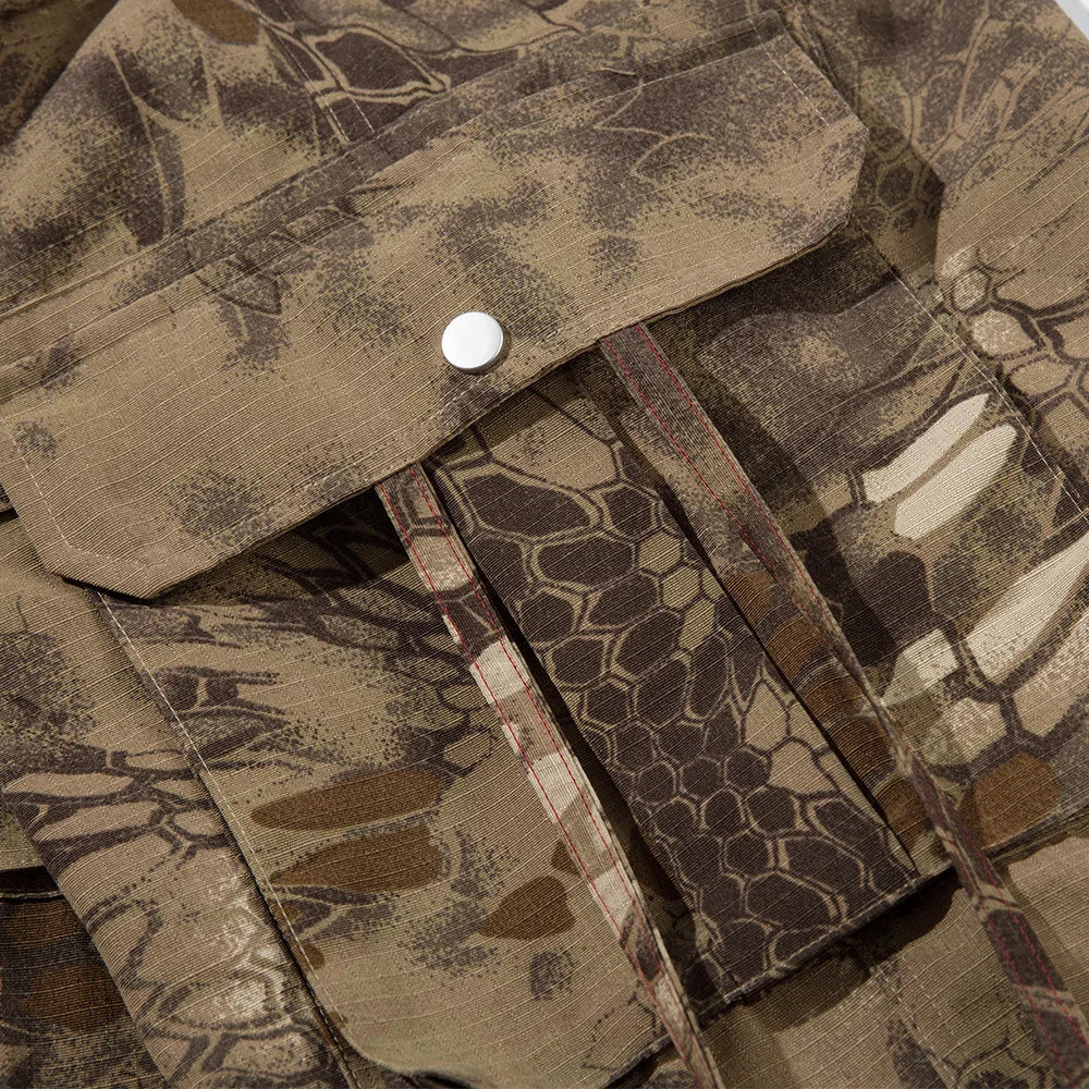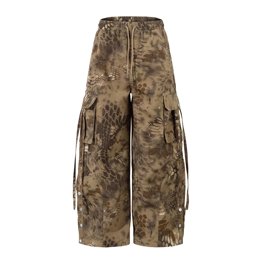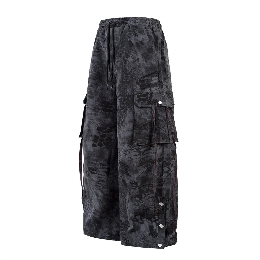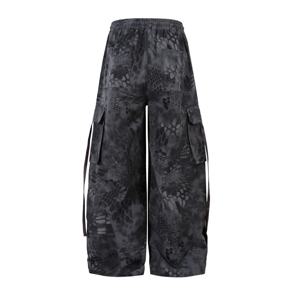 Inspired by the elusive echoes of the mountains, these wide-leg camo cargos are built for the urban explorer. The muted brown and black tones blend seamlessly into concrete backdrops or woodland scenes, while the abstract scale and claw-like patterning subtly nods to cryptic folklore creatures.