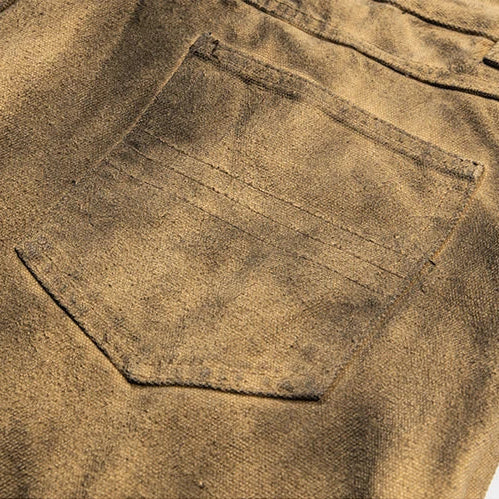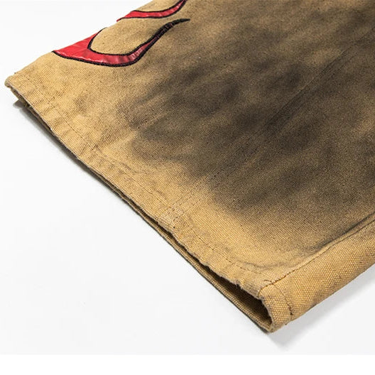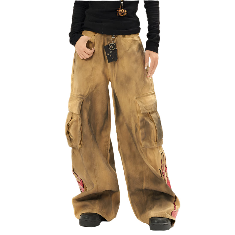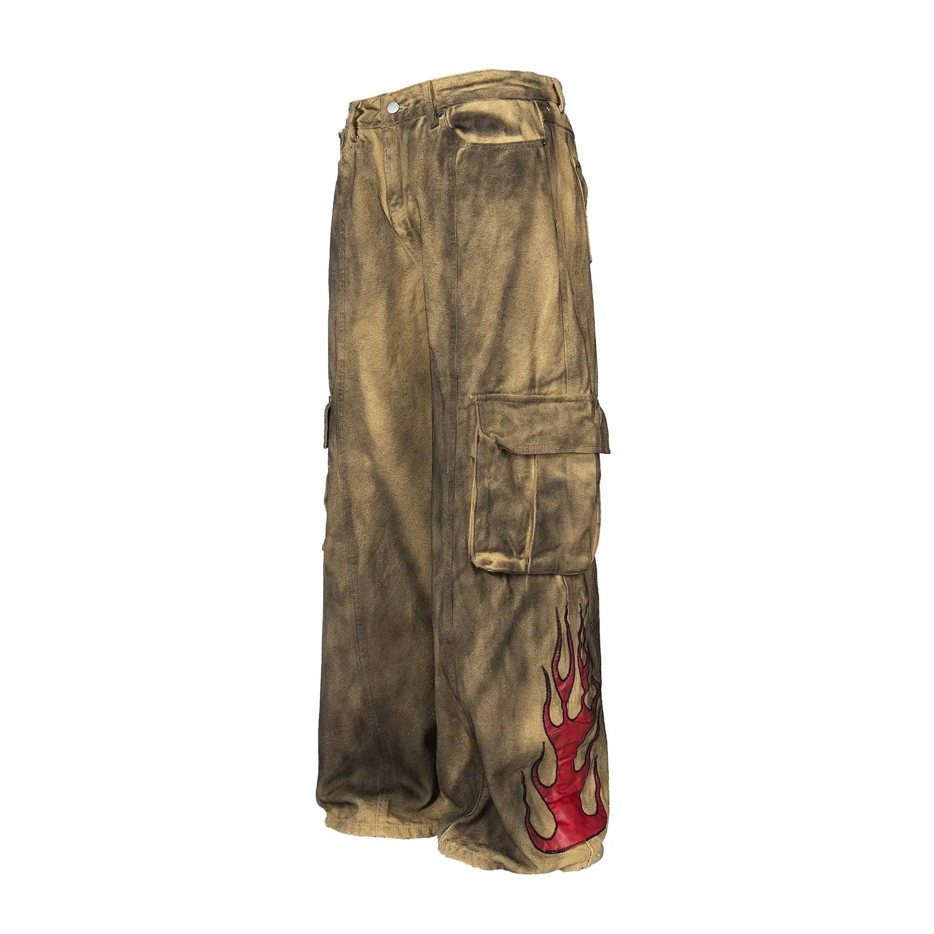 A rare silhouette forged from fire and utility. These oversized trousers are made from heavyweight cotton twill and dyed in a deep smoke washed ochre, a tone that shifts between scorched tan and oxidized gold depending on the light. Each leg carries custom flame graphics in molten red, wrapping from hem to knee like rising embers.