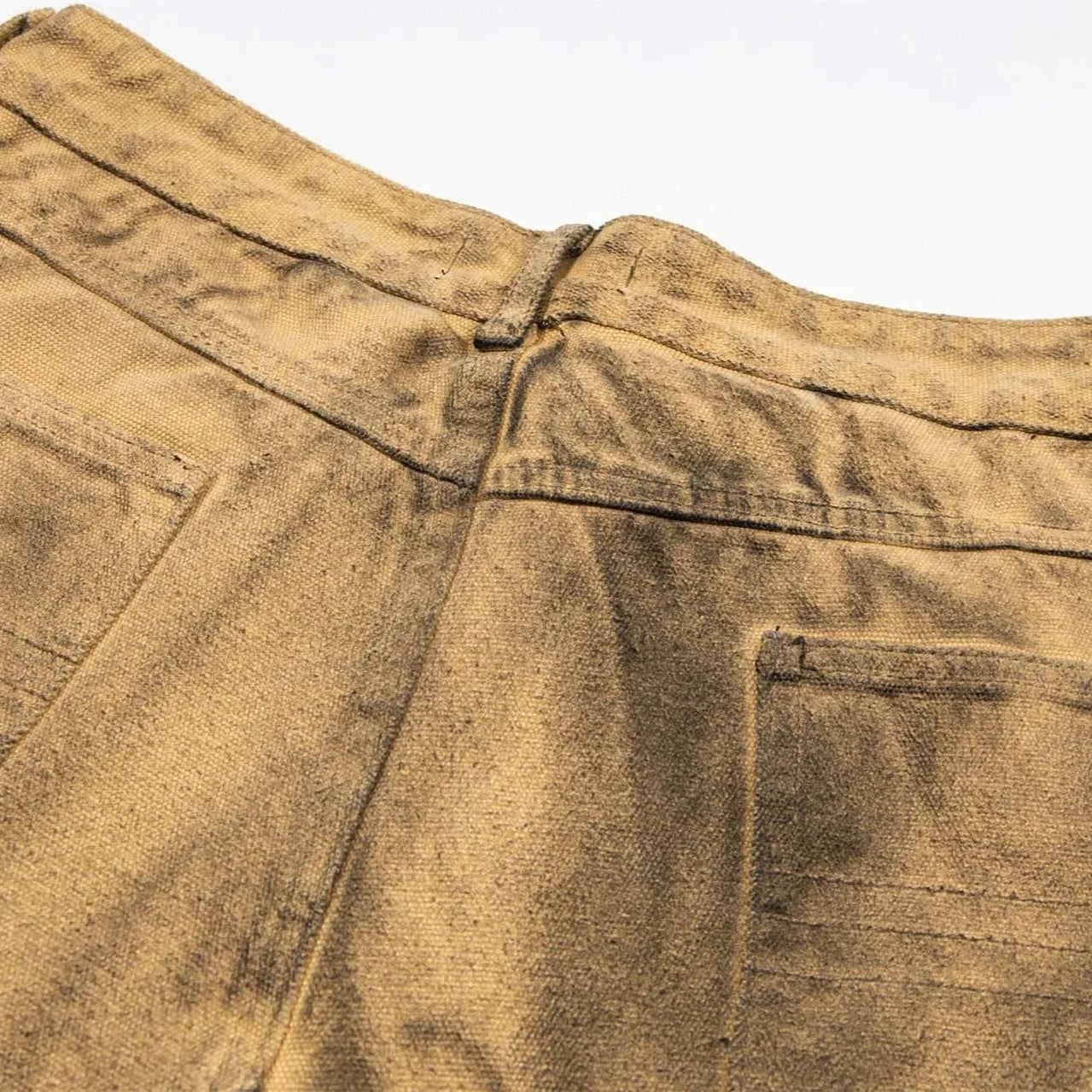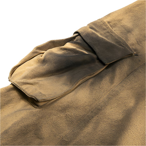 The pigment treatment creates depth and burn-like tonal variation, giving every pair a unique surface. The structure is exaggerated, with a wide puddling leg and oversized cargo pockets that nod to military archive cuts while carrying a destructive, artistic edge.