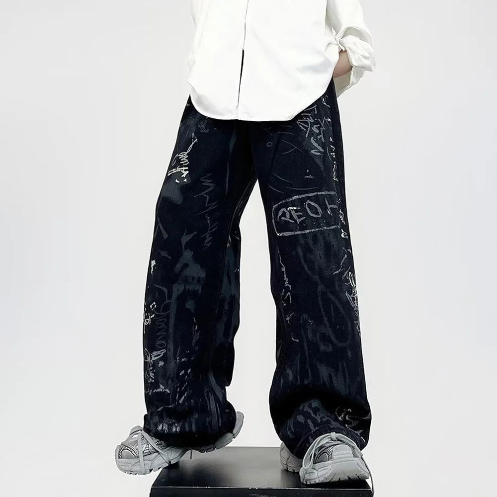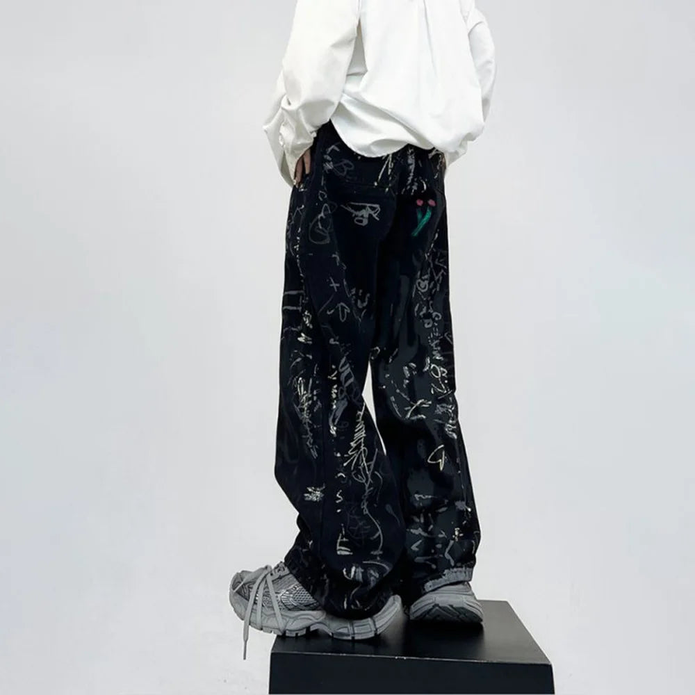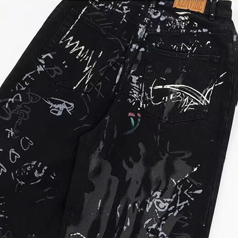 Layered in white graffiti made of cryptic symbols, hand drawn tags, and abstract sketches, the design feels like a back alley wall pulled straight from Tokyo’s underground. The wide leg silhouette creates a sharp modern profile that holds structure while remaining effortless.