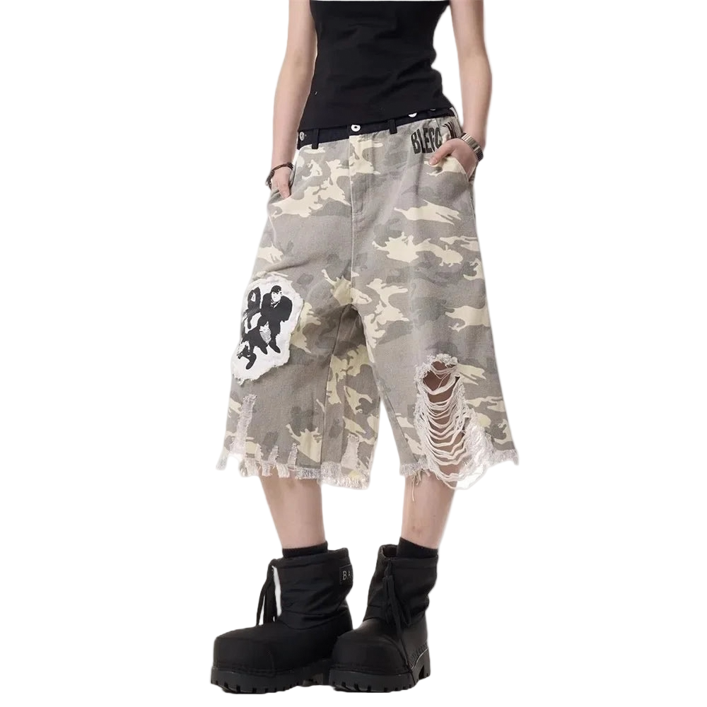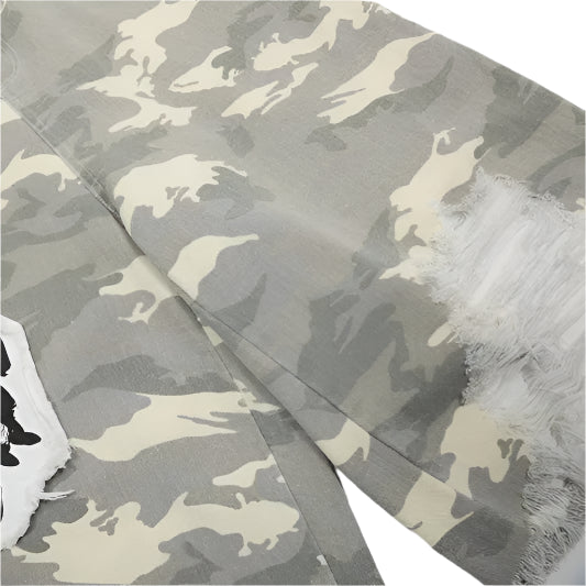 Frayed hems and deliberate knee shredding introduce a sense of controlled deconstruction. A contrast black waistband with grommet detailing breaks the pattern and adds industrial weight. Highlighting the left leg is a stitched black patch featuring a group silhouette, transformed into a dark cameo of subculture mystery.