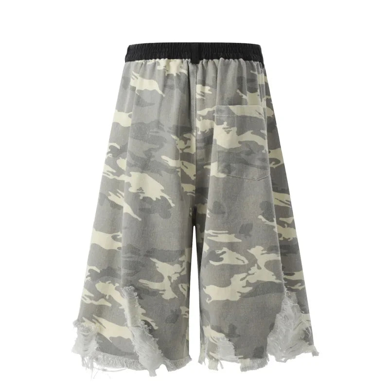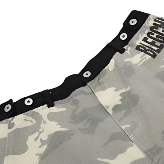 An oversized statement piece rooted in tailored rebellion. These long shorts are cut from midweight cotton twill with a matte washed texture that feels structured yet softened for a lived in touch. The color palette blends bleached grey camo in tones of ash and slate.