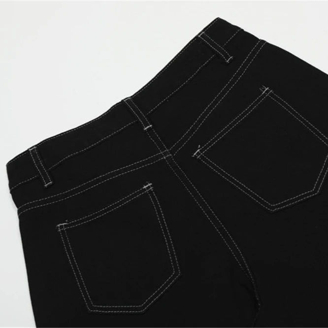 Multi-panel construction with arced seam lines; contrast stitch mapping; angled back yoke; full belt loops.