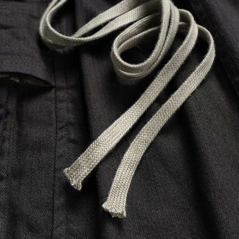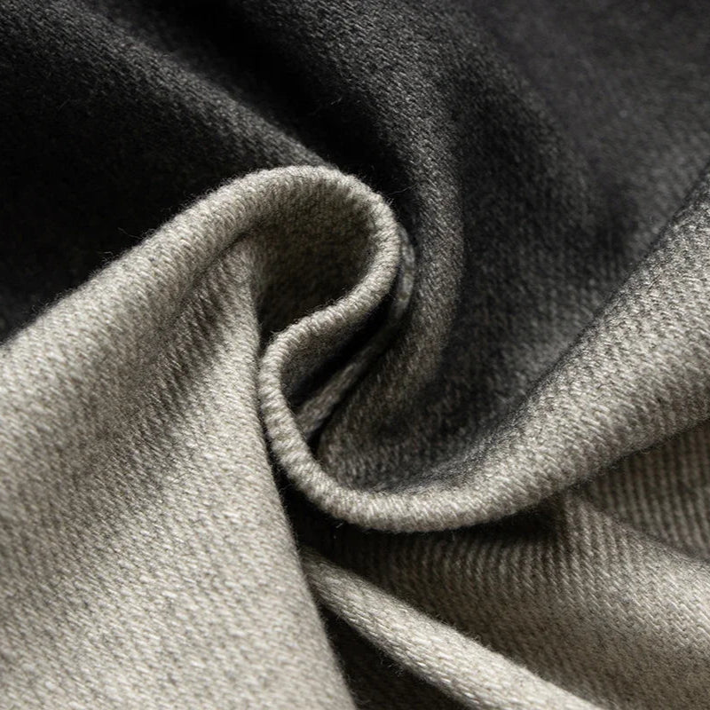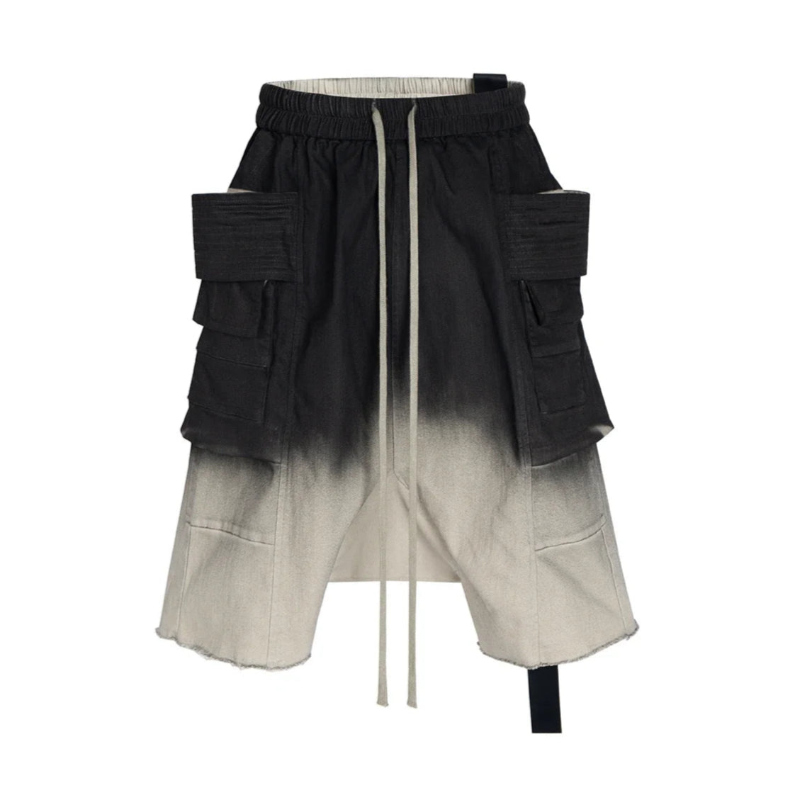 A directional silhouette defined by engineered fading and architectural volume. Cut from premium midweight cotton twill, the fabric has a dry, structured texture softened by garment washing. A hand-applied gradient fade transitions from washed bone at the waist to deep black at the hem.