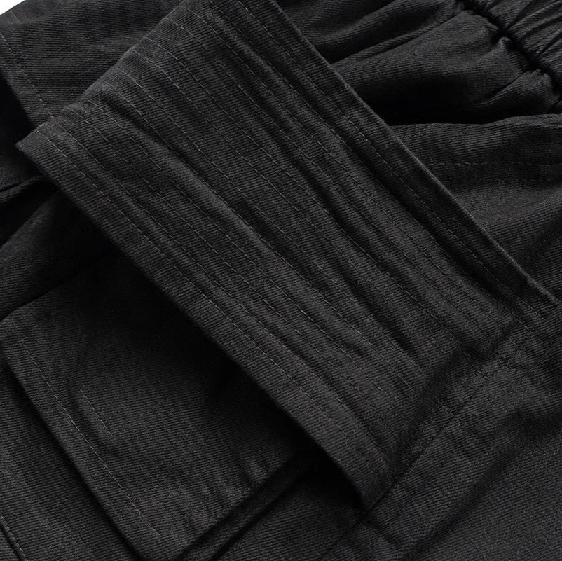 The side profile is shaped by oversized cargo pockets with layered flaps and reinforced panel bases. A dropped crotch and wide, slightly tapering leg shape create a bold structure that maintains ease of movement.
