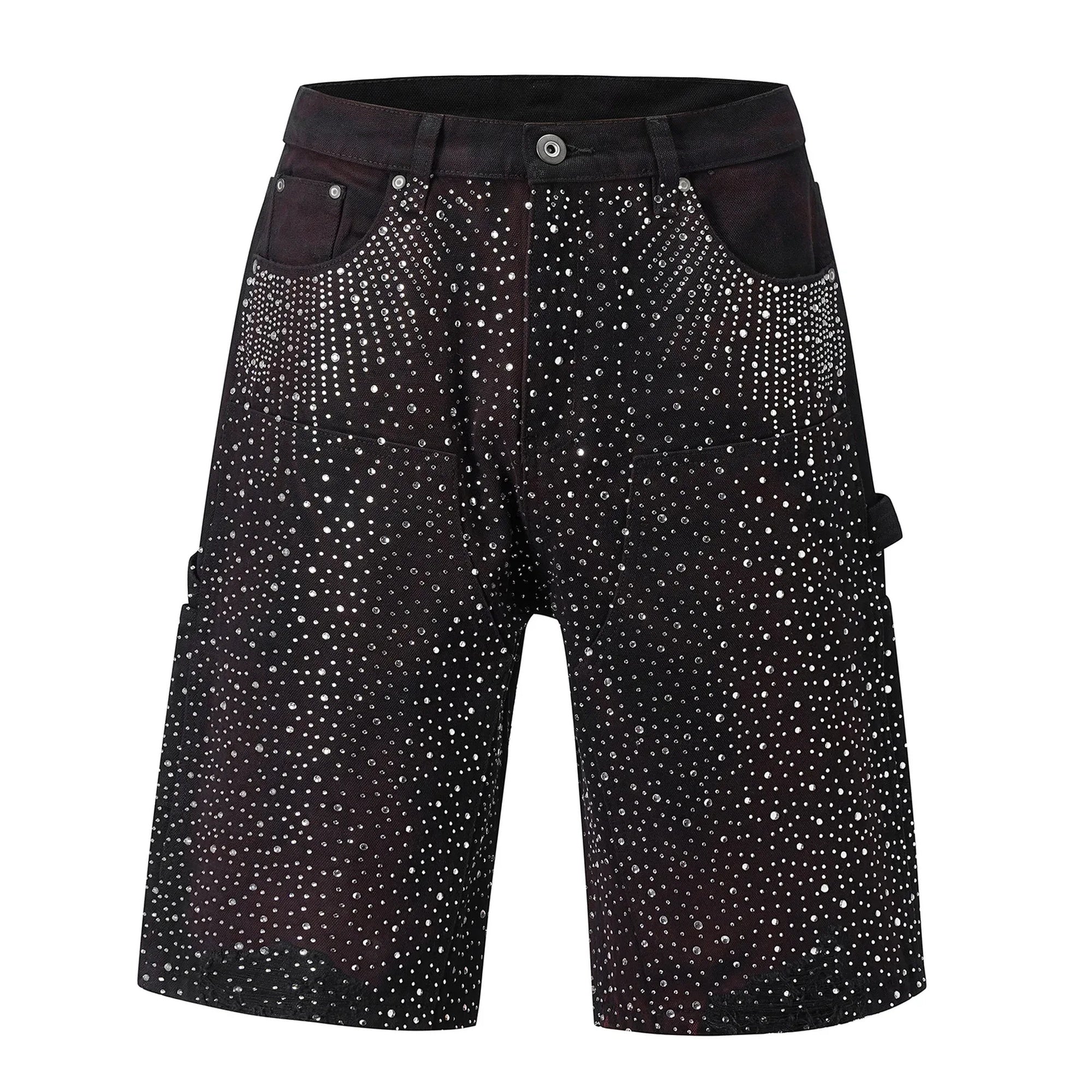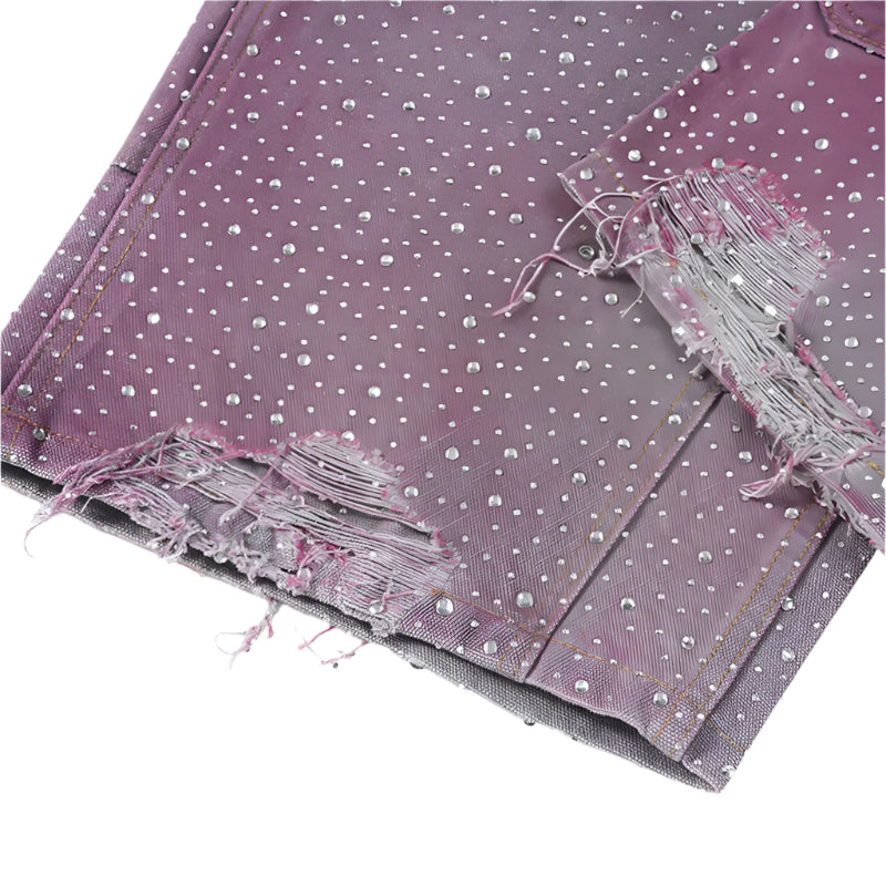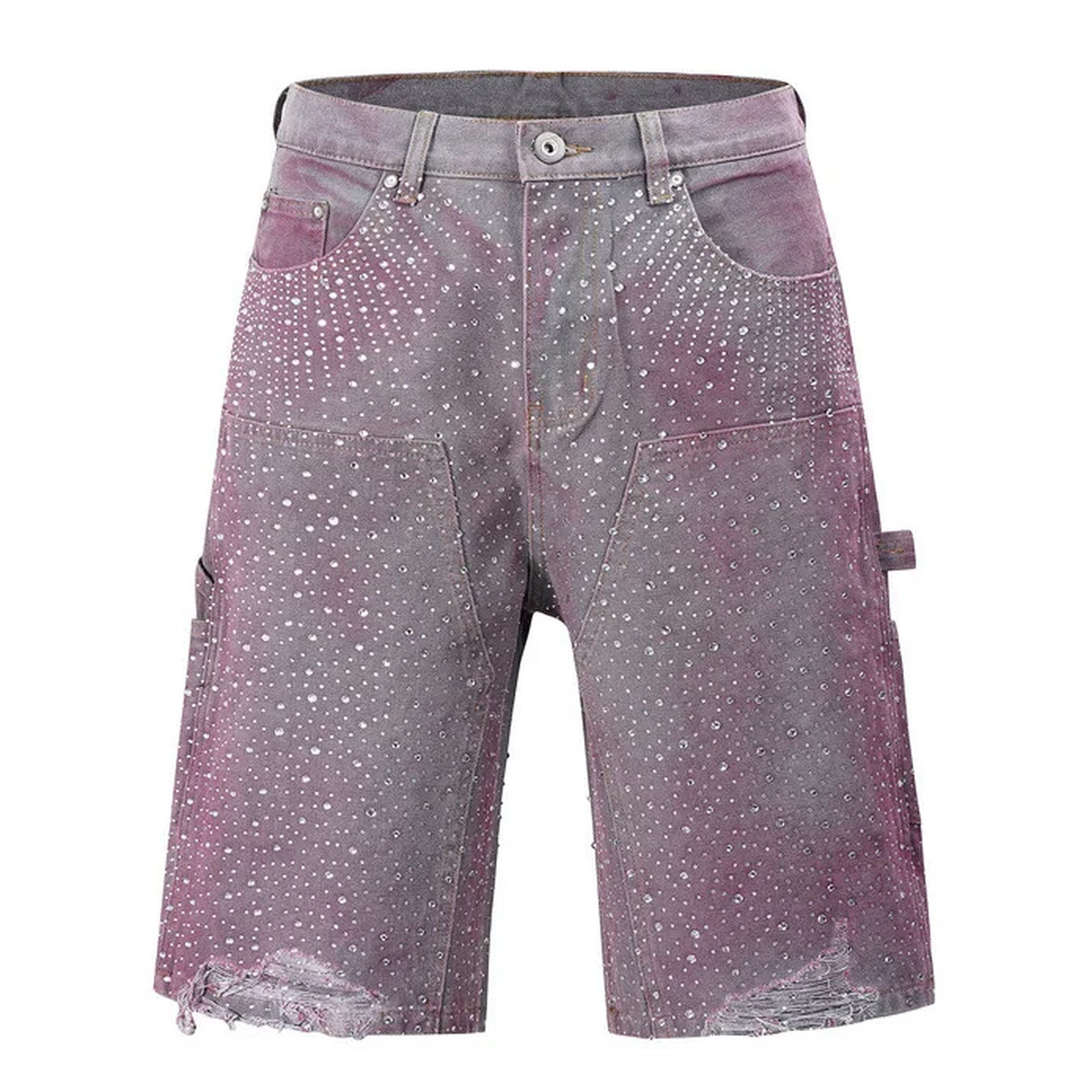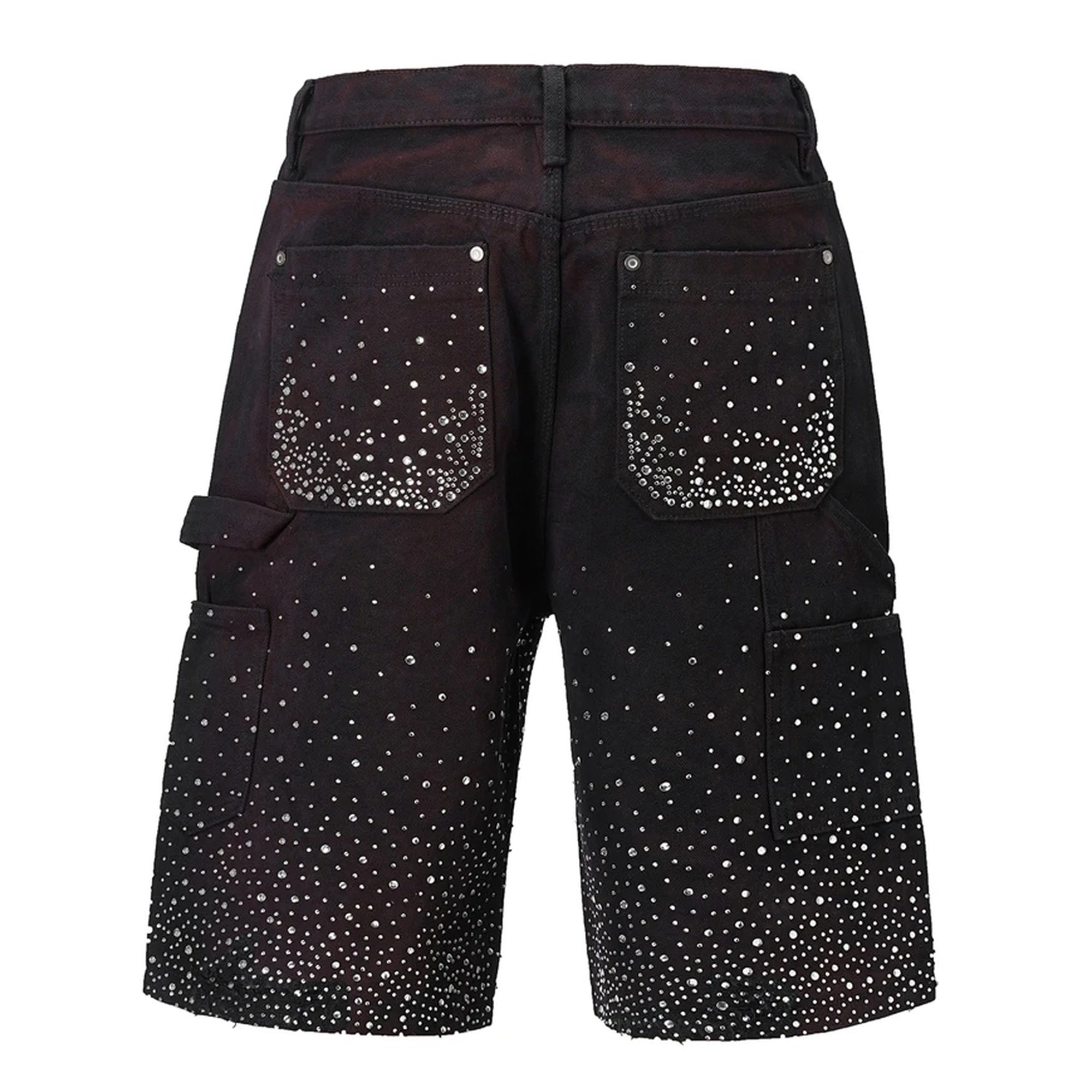 A bold hybrid of glam and grit, these cargo shorts bring a celestial twist to utilitarian denim. The fabric is midweight cotton denim, structured enough to hold its shape yet soft washed for comfort. Covered in high density rhinestone studs, the gradient wash shifts from dusty mauve to deep twilight plum or charcoal burgundy, depending on the version.