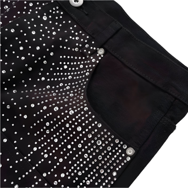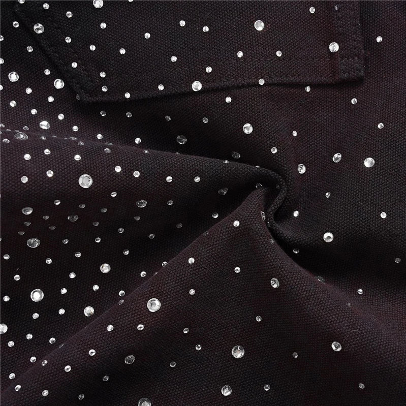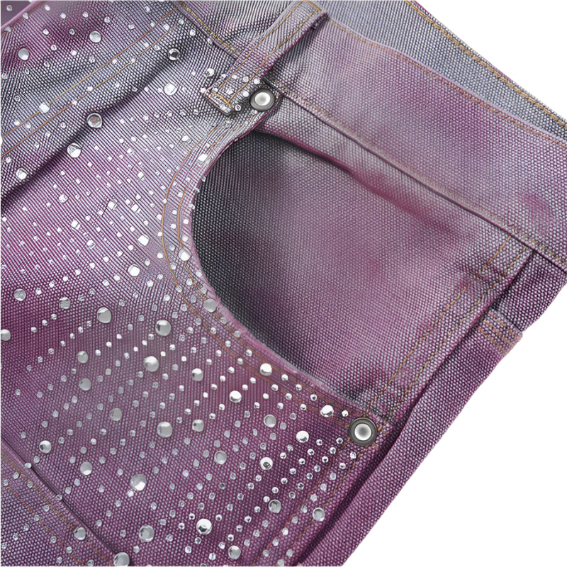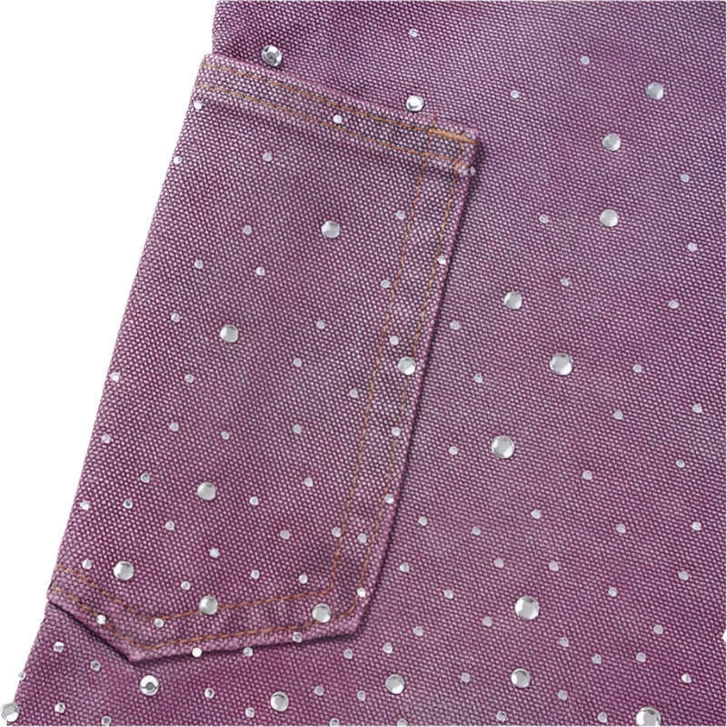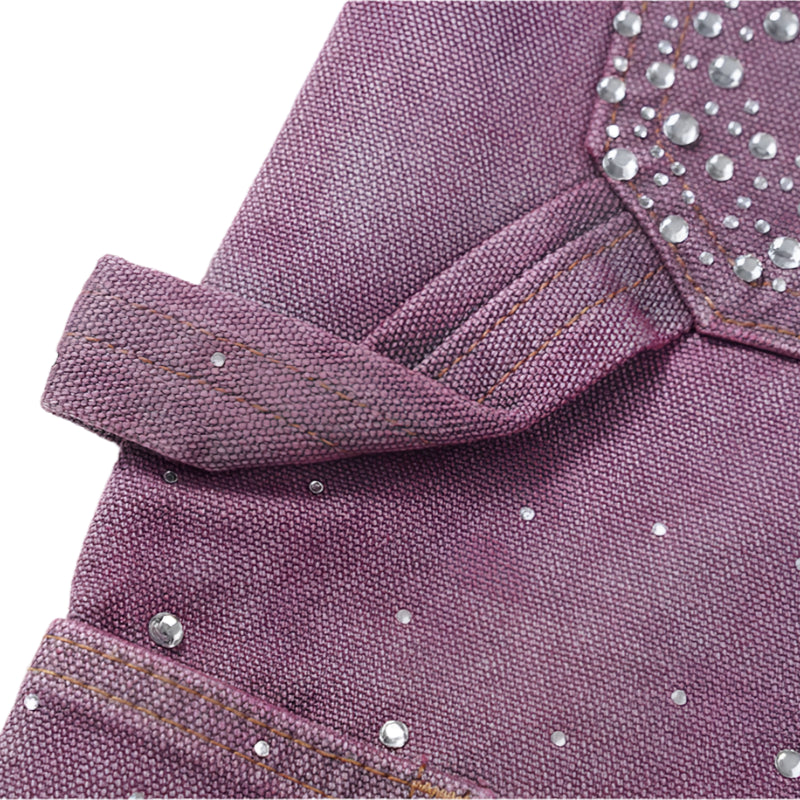 A bold hybrid of glam and grit, these cargo shorts bring a celestial twist to utilitarian denim. The fabric is midweight cotton denim, structured enough to hold its shape yet soft washed for comfort. Covered in high density rhinestone studs, the gradient wash shifts from dusty mauve to deep twilight plum or charcoal burgundy, depending on the version.