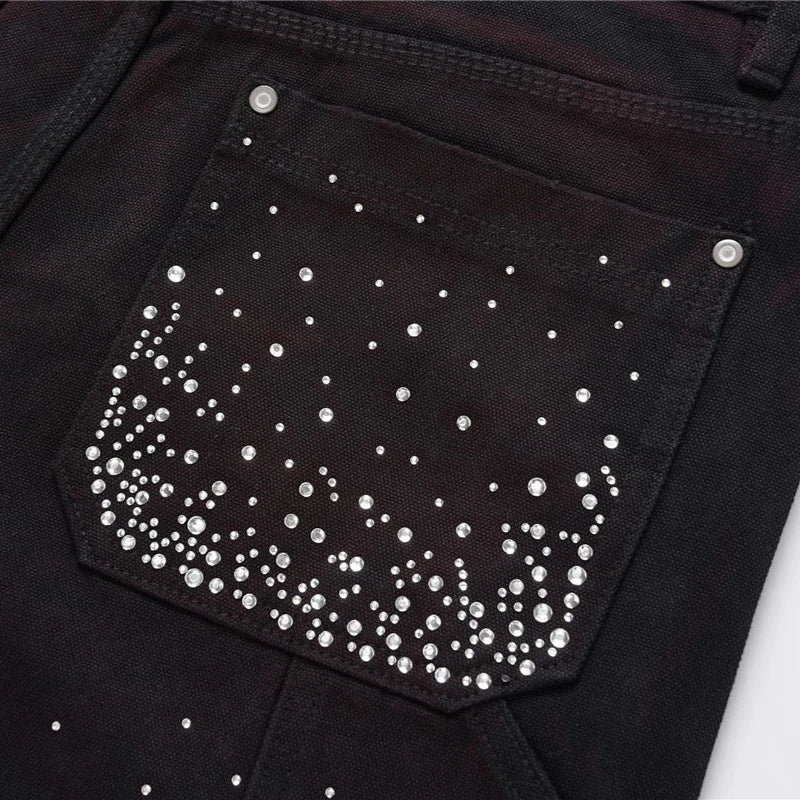 Each pair features blown out distressing near the hem and frayed raw edges that contrast sharply against the controlled studded pattern. Functional side cargo pockets and a hammer loop add workwear utility, while the rhinestones radiate outward from the front pockets in a starburst formation that feels engineered rather than random.
