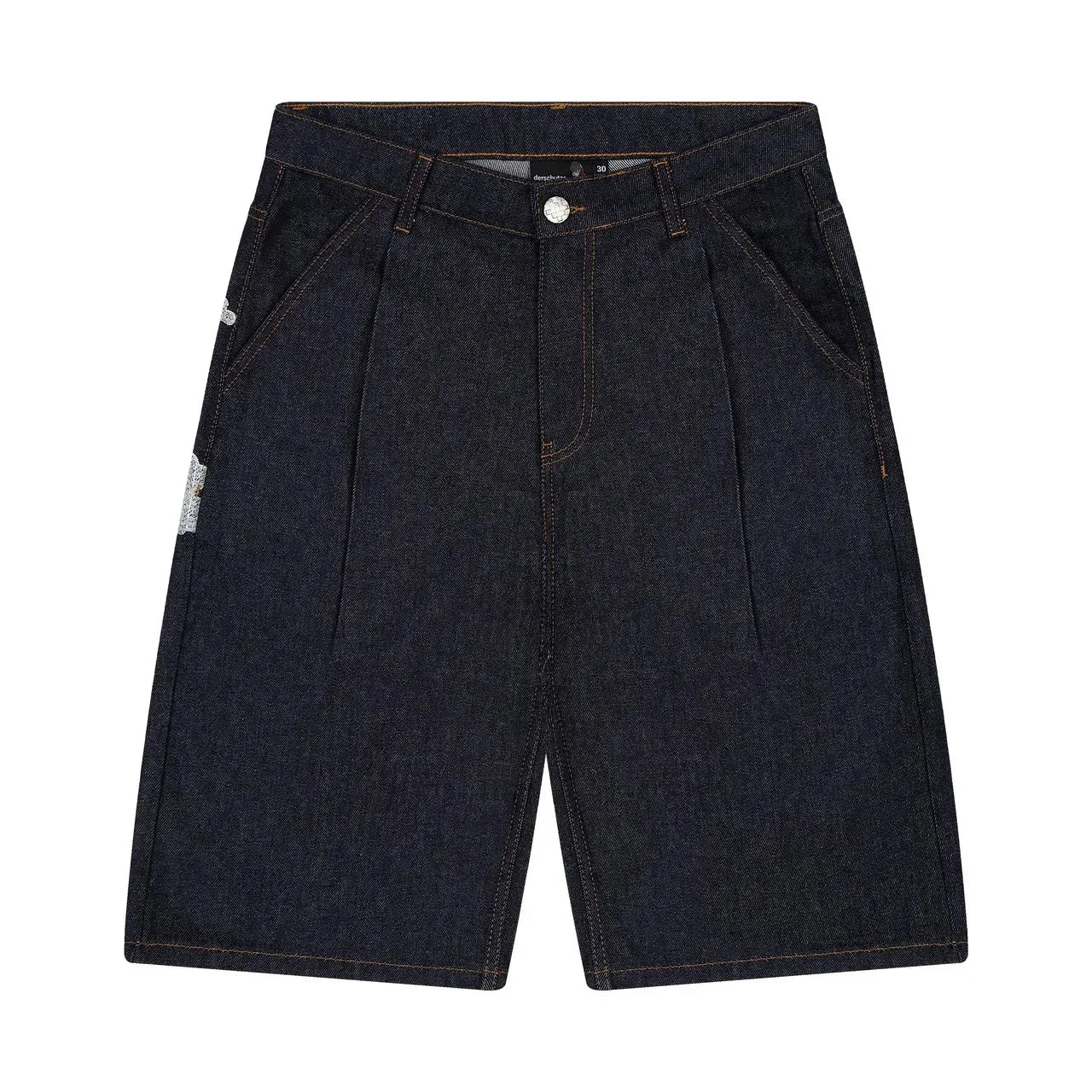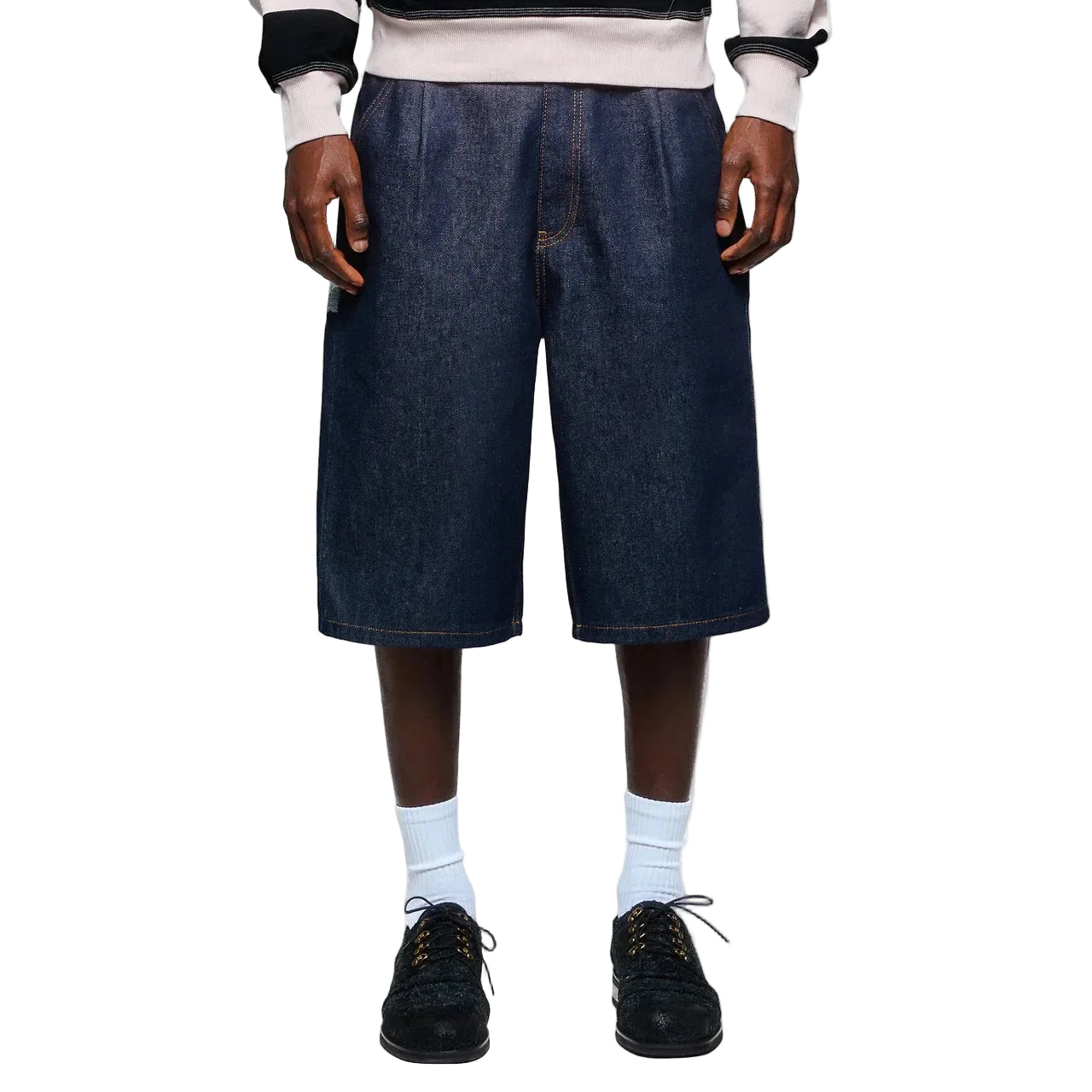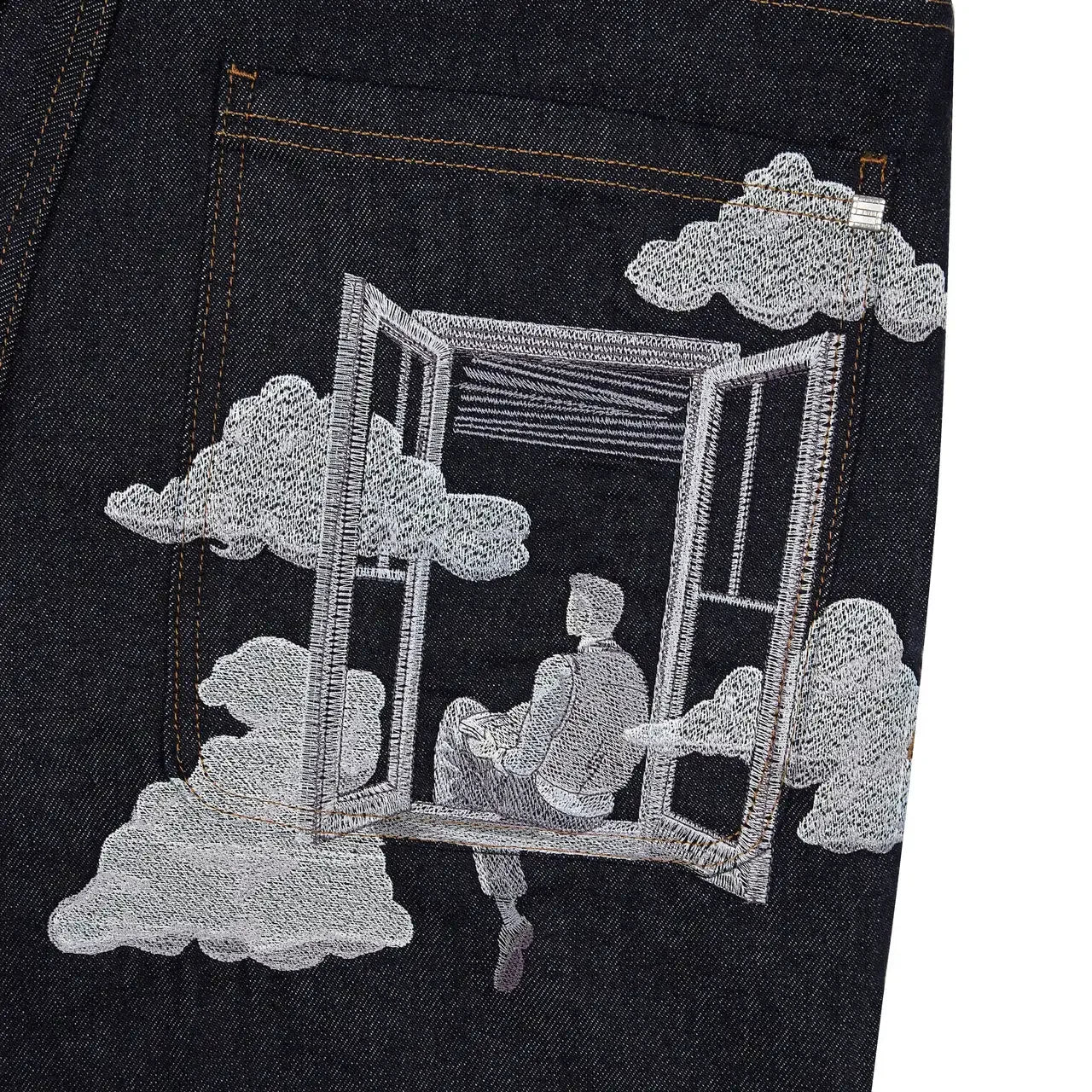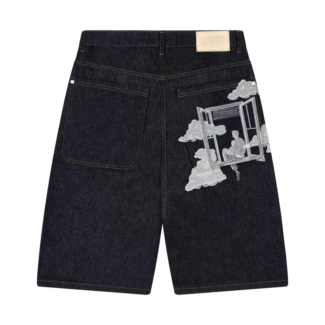 A quiet, surreal moment embroidered onto a premium silhouette. These indigo washed denim shorts feature a finely stitched back panel depicting a figure gazing out of an open window, surrounded by drifting clouds. The design feels dreamlike without being loud, anchored by precise detailing and clean construction.
