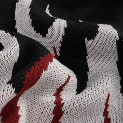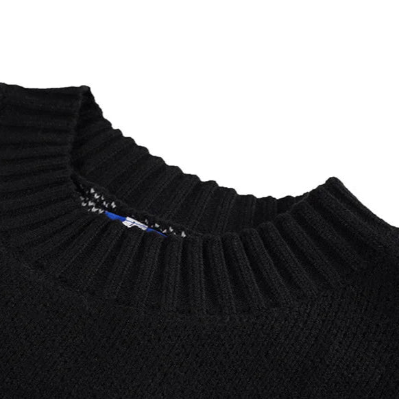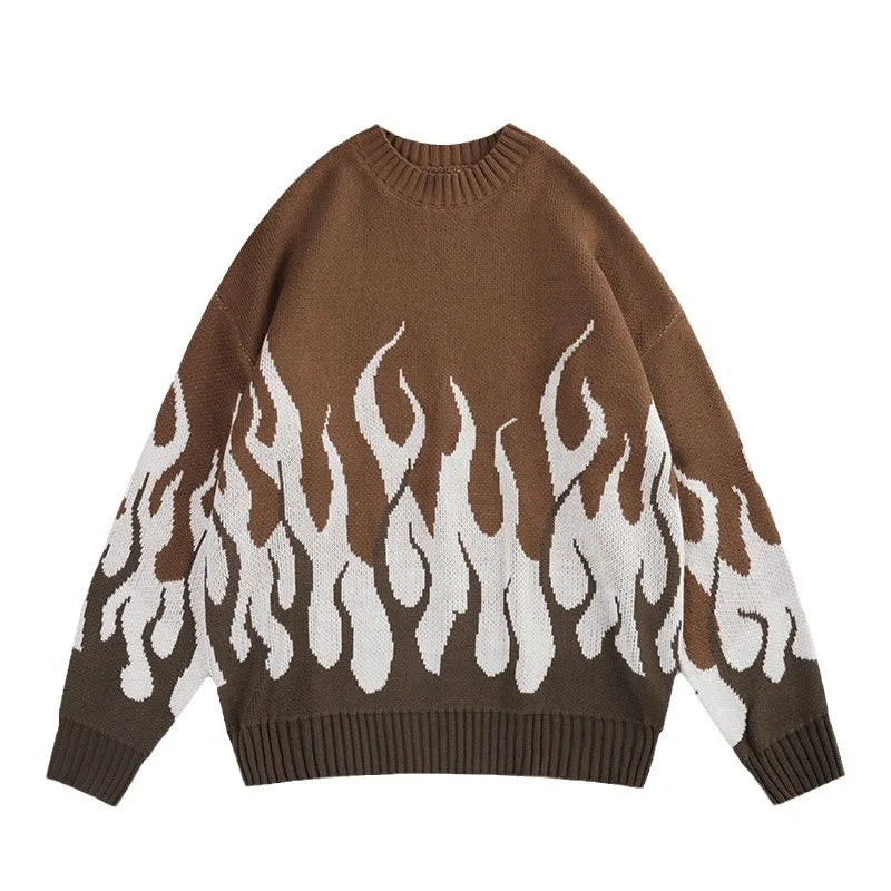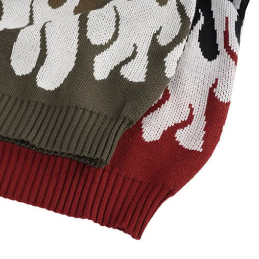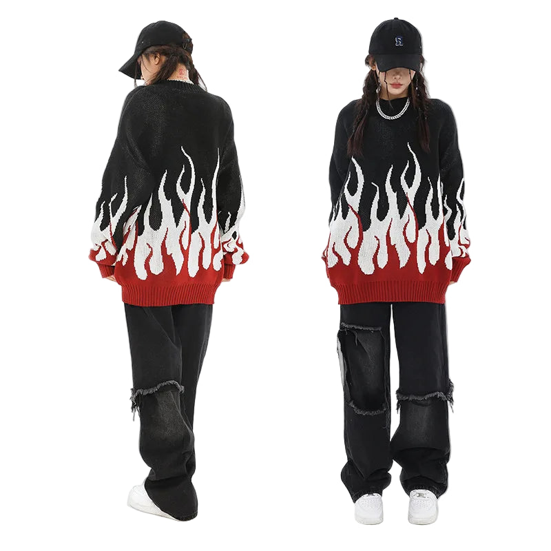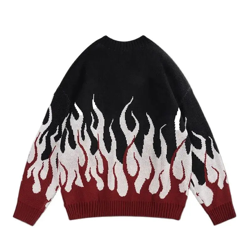 A heavyweight unisex sweater featuring flame motifs embroidered across the front in red and white over a solid black base. Made from a polyester, acrylic and wool blend, it offers a structured oversized fit with ribbed cuffs and hem to hold its shape.