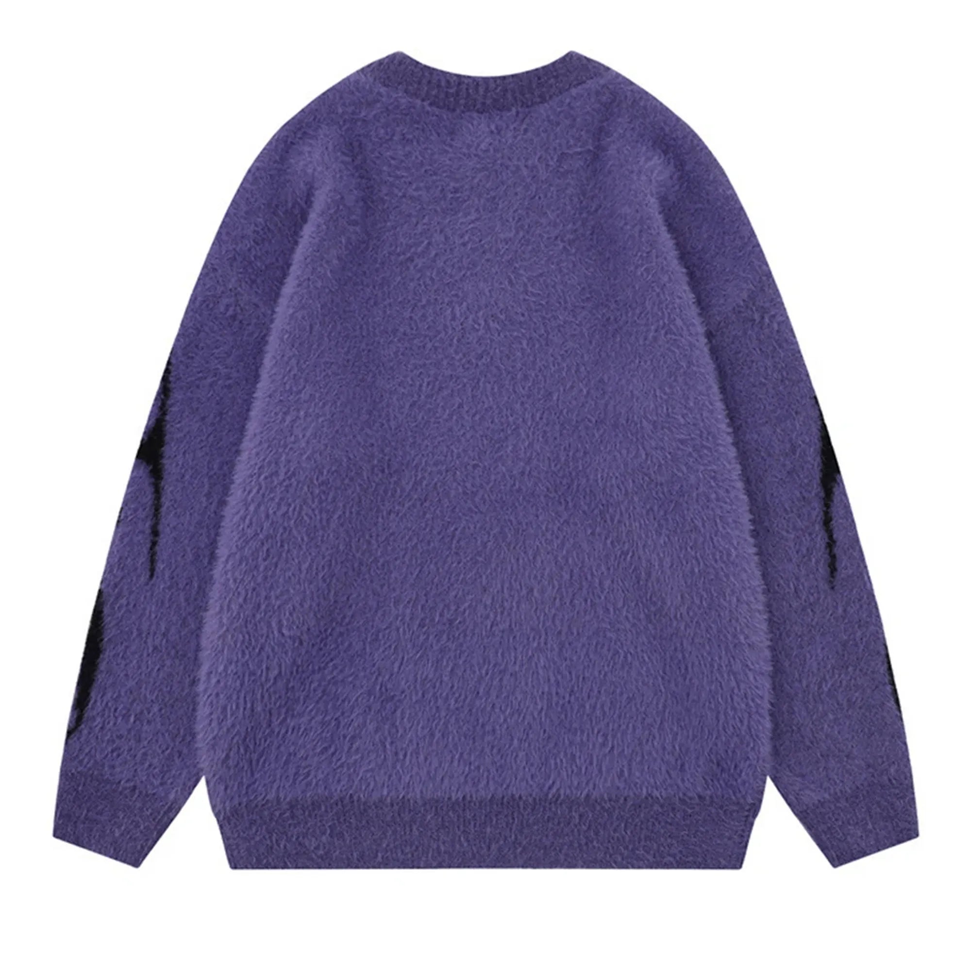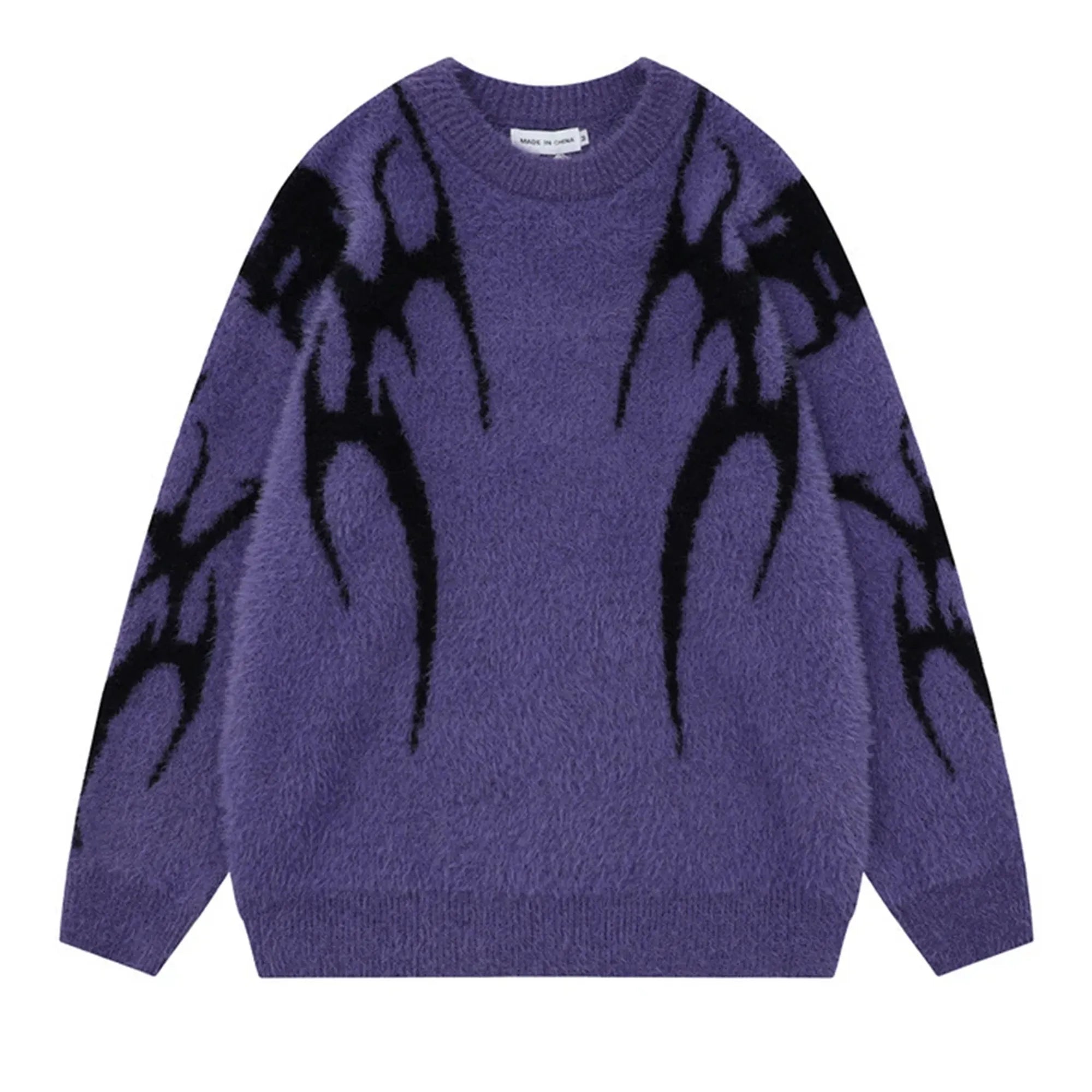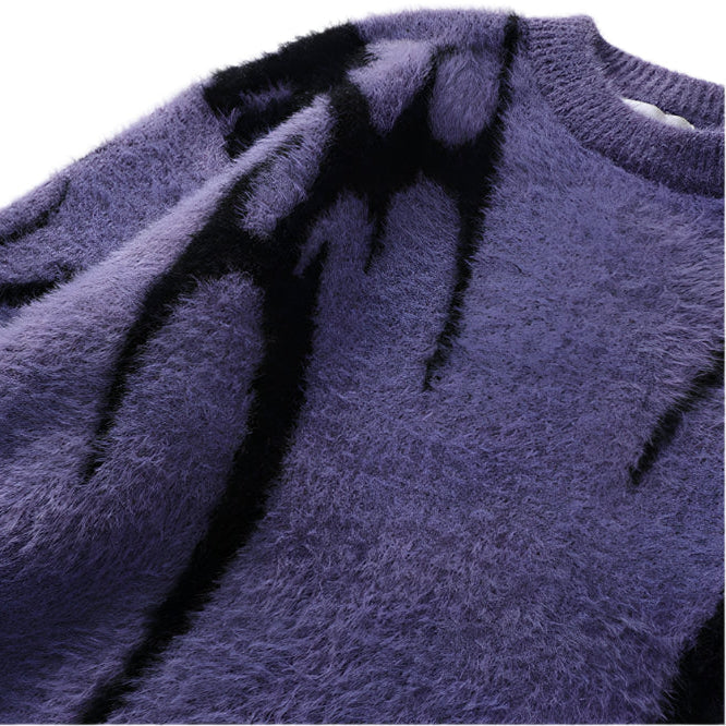 Jet-black and deep violet versions both feature flame-like intarsia patterns climbing the sleeves and shoulders, merging grunge, metal, and minimalism into one silhouette. Dropped shoulders, wide body, and ribbed trim keep the shape relaxed but structured.