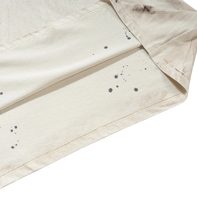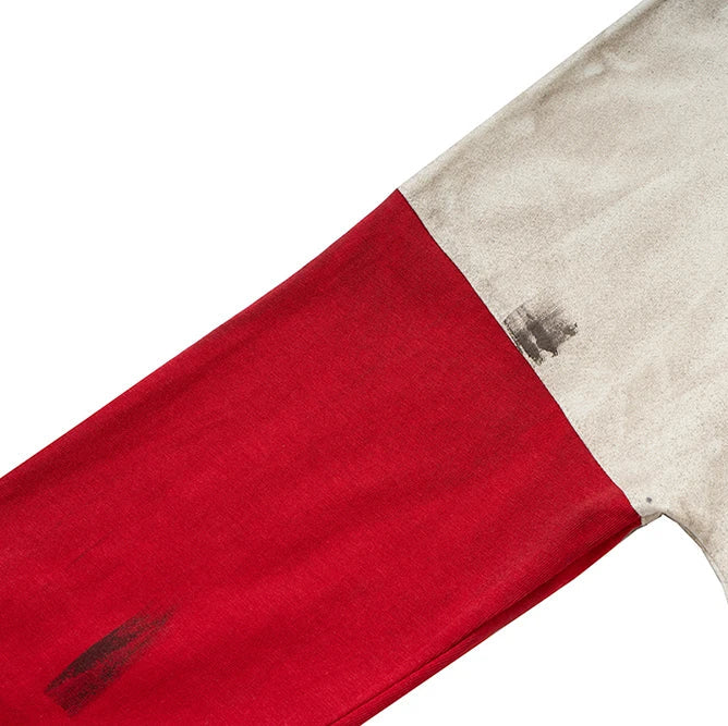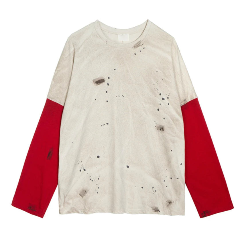 A raw layered essential marked by contrast and corrosion. The washed ivory body is disrupted by splattered black stains, each one irregular and unpredictable like paint residue on industrial fabric. Deep red sleeves cut through the neutral tone with sharp intent, bringing a sense of danger and aftermath.