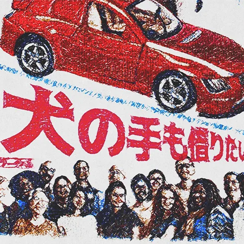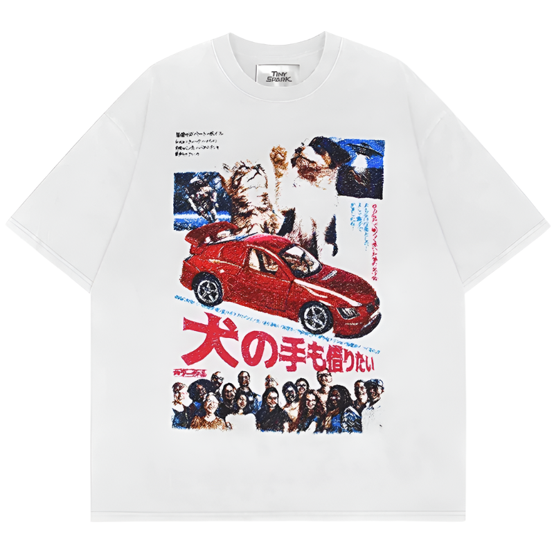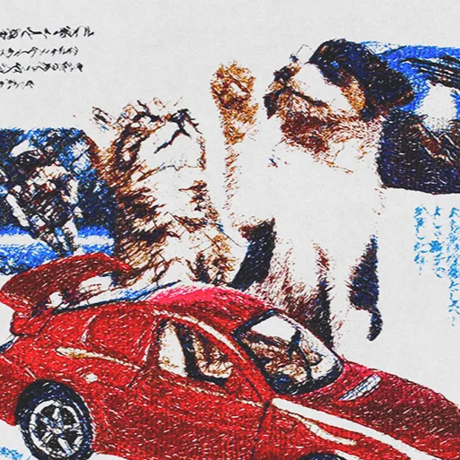 Printed in a pixel grain finish that mimics stitched embroidery or worn ink, the design layers cats, cars, and cast-like characters over Japanese text that echoes street flyers and cult cinema covers. It is absurd, clever, and quietly reverent, a visual artifact of pop Japan at its most unfiltered.
