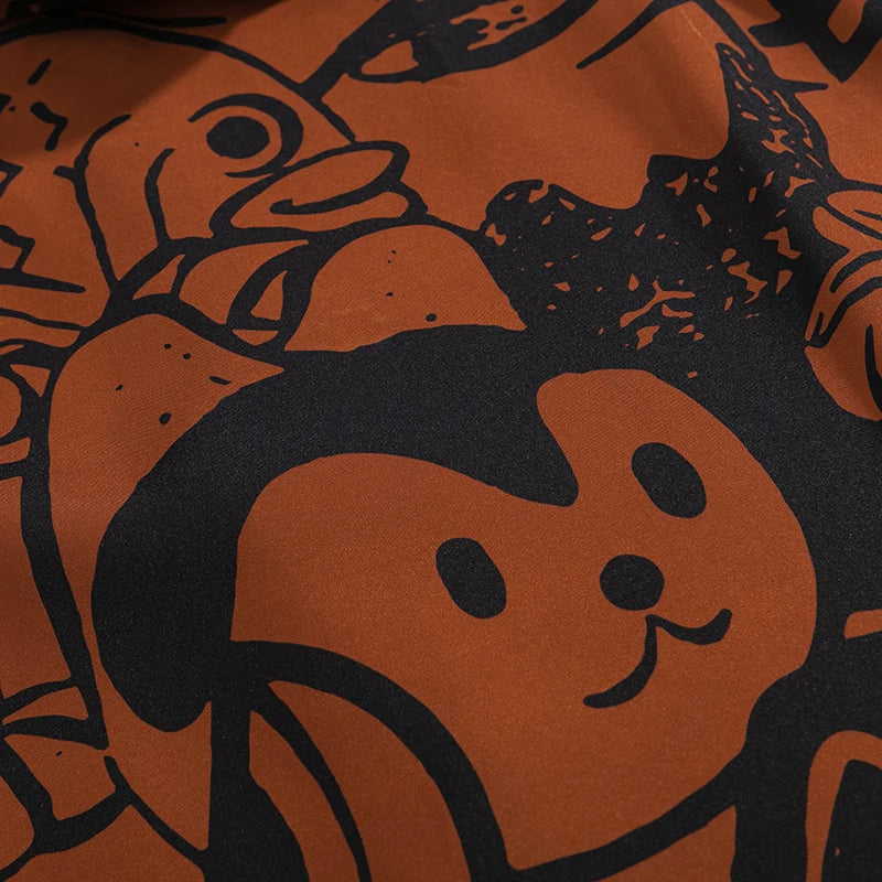 The asymmetric paneling and loud composition evoke the feel of underground manga art meets yōkai folklore, turning every inch of the shirt into a visual overload.