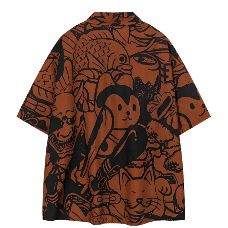 Crafted from structured cotton poplin that holds its shape while offering a smooth and breathable finish. This open collar woven shirt features a split tone layout in bone white and black, covered in graphic illustrations of oni masks, sake bottles, maple leaves, and stylized smoke.