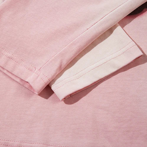 A surreal collage of blurred thoughts and ghostlike figures sprawls across this washed pink long sleeve, part sketchbook and part fever dream. The stencil style graphics feature a cat, a shadowy silhouette, floating text, and abstract spray motifs that feel personal yet cryptic.