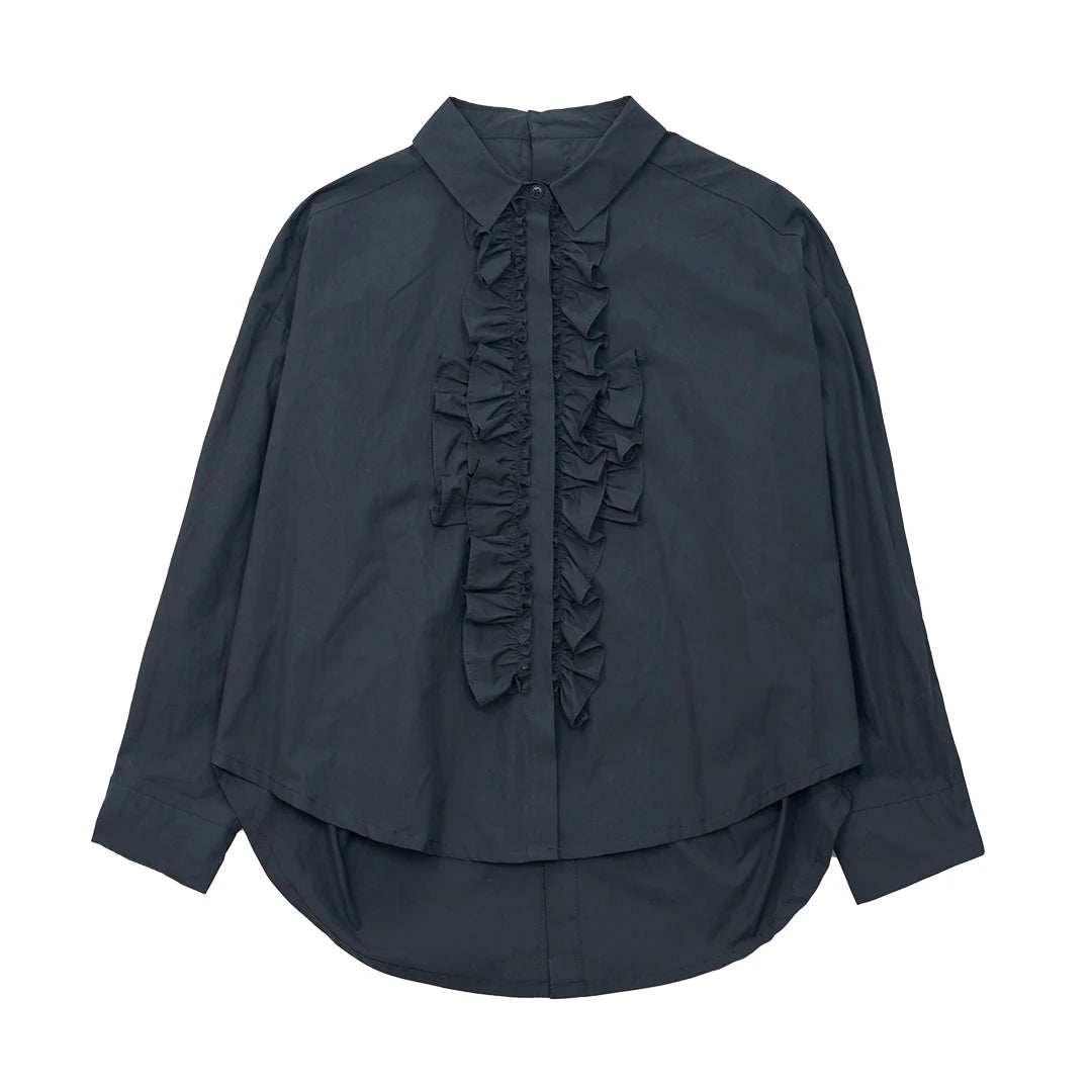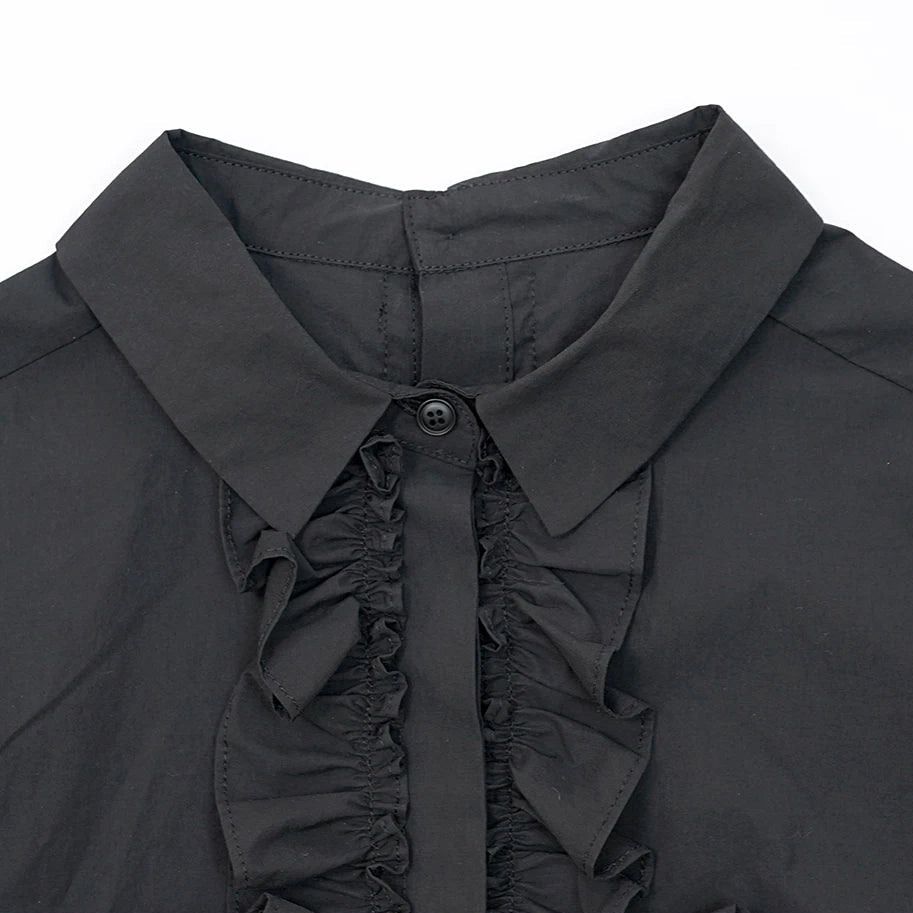 Running down both the front and back is a spine of gathered satin ruffles, stitched with sharp consistency to catch light subtly without overwhelming the matte cotton base. Every detail, from the rear button placket to the reinforced shoulder seams, reflects restrained craftsmanship balanced with edge.