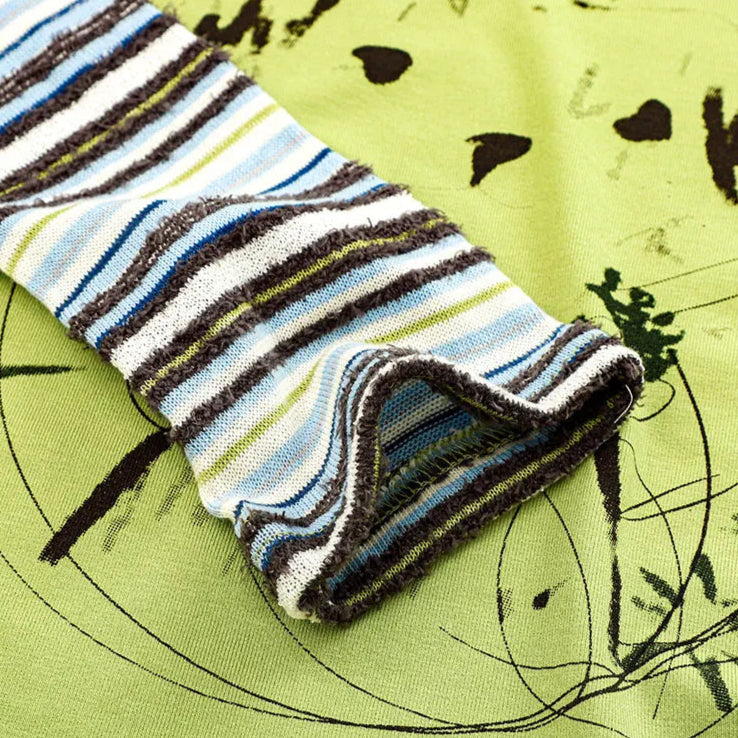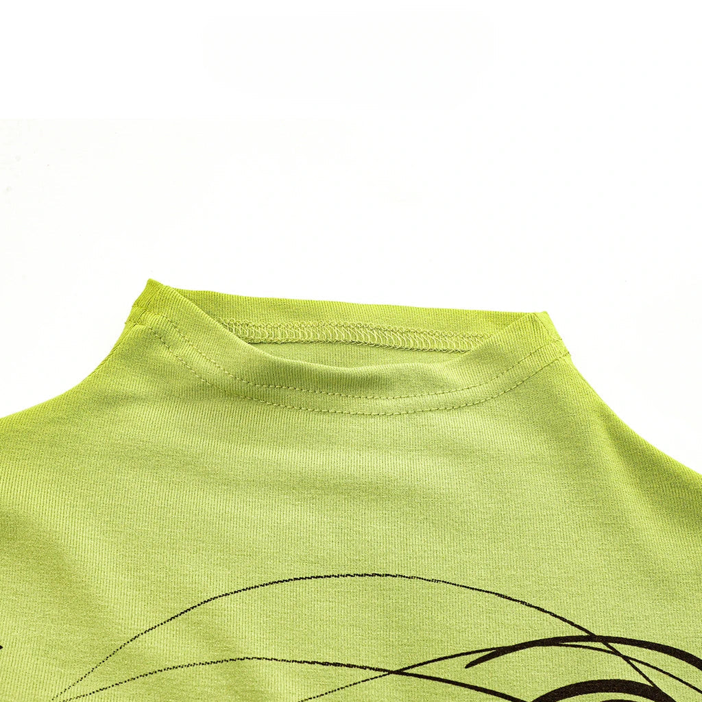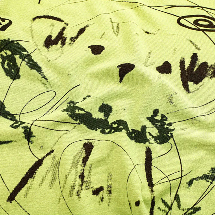 This mock neck top brings playful irreverence into sharp construction. Cut from compact cotton-blend jersey in a vivid lime tone, the body holds a clean, structured drape while allowing light stretch for comfort. Across the front, a hand-drawn dog motif unfolds in loose black strokes, encircled by abstract spirals, hearts, and stars that lend a raw, expressive energy.