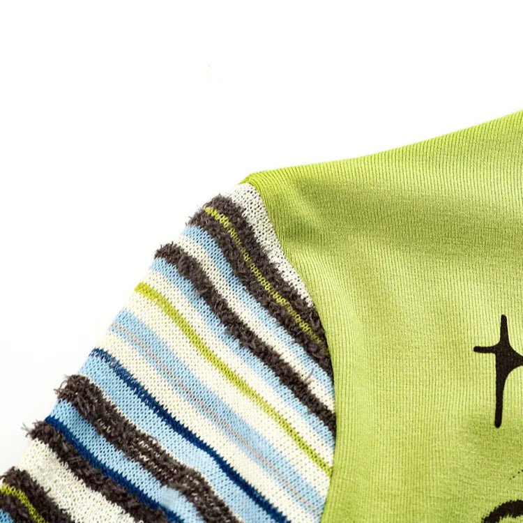 Sleeves: Contrasting knit in multi-stripe, extended for exaggerated proportions