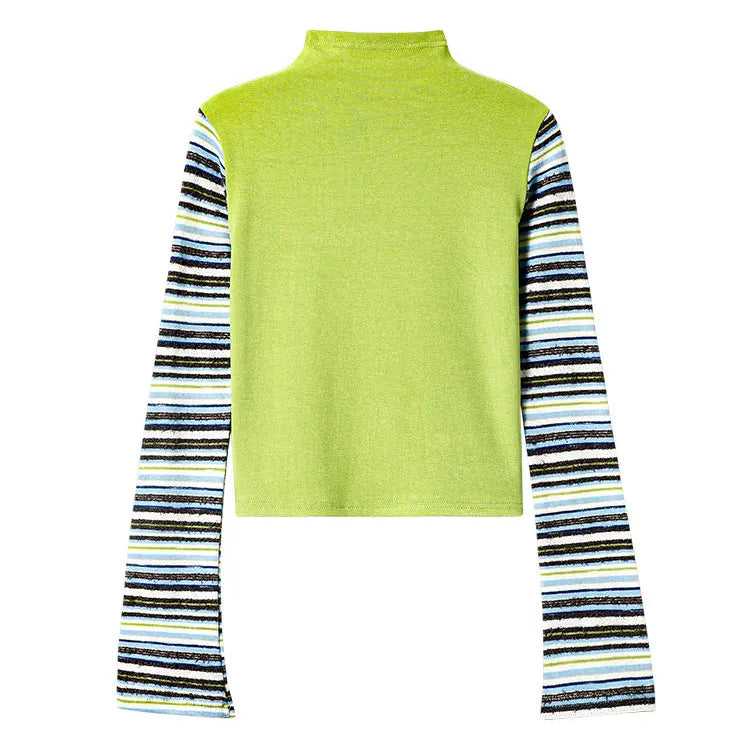 The sleeves break the rhythm with contrasting striped knit, crafted in textured yarns of black, blue, ivory, and lime. Their elongated, lightly flared proportions exaggerate movement, heightening contrast against the pared-back body.