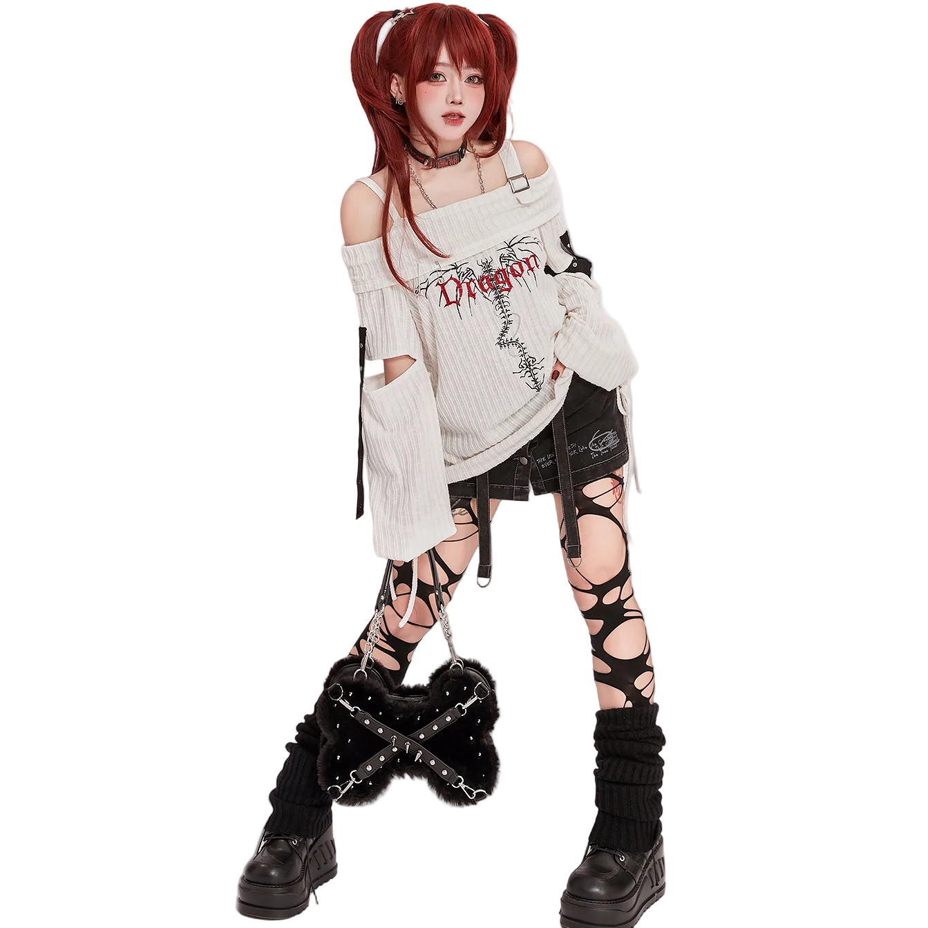 A folded off-shoulder neckline defines this knit, supported by twin shoulder straps. Centered on the chest, a crimson “Dragon” in gothic blackletter crowns a black dragon artwork: wings spread across the front, while the scaled body runs vertically down into an ornate, talon-like tail.