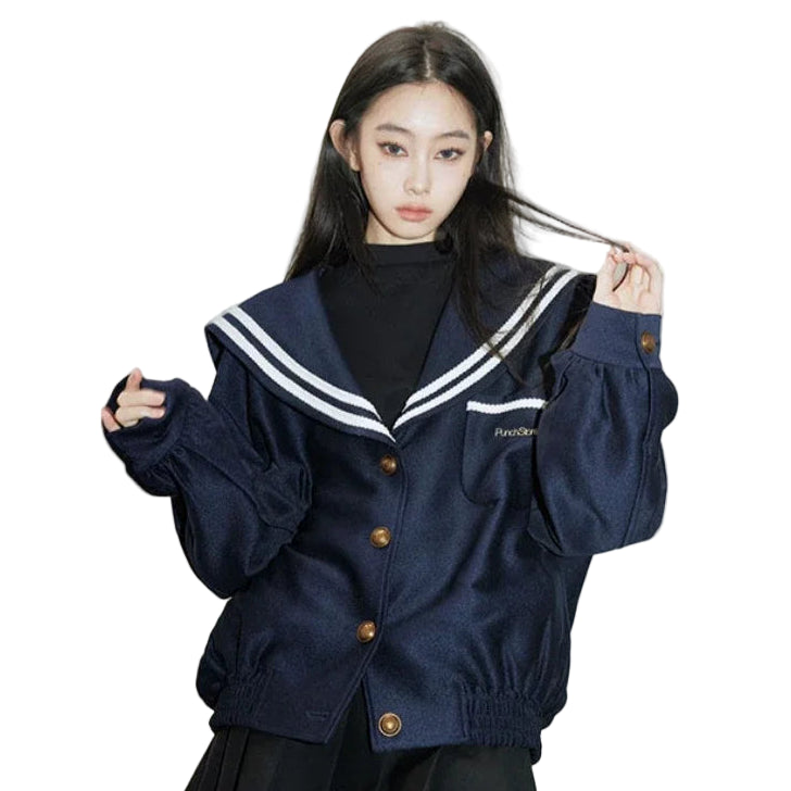 This jacket takes inspiration from the Japanese sailor uniform and translates it into refined outerwear for modern streetwear. The wide sailor collar sharply cut and finished with twin white stripes, extends across the shoulders and back, anchoring the piece with cultural resonance.