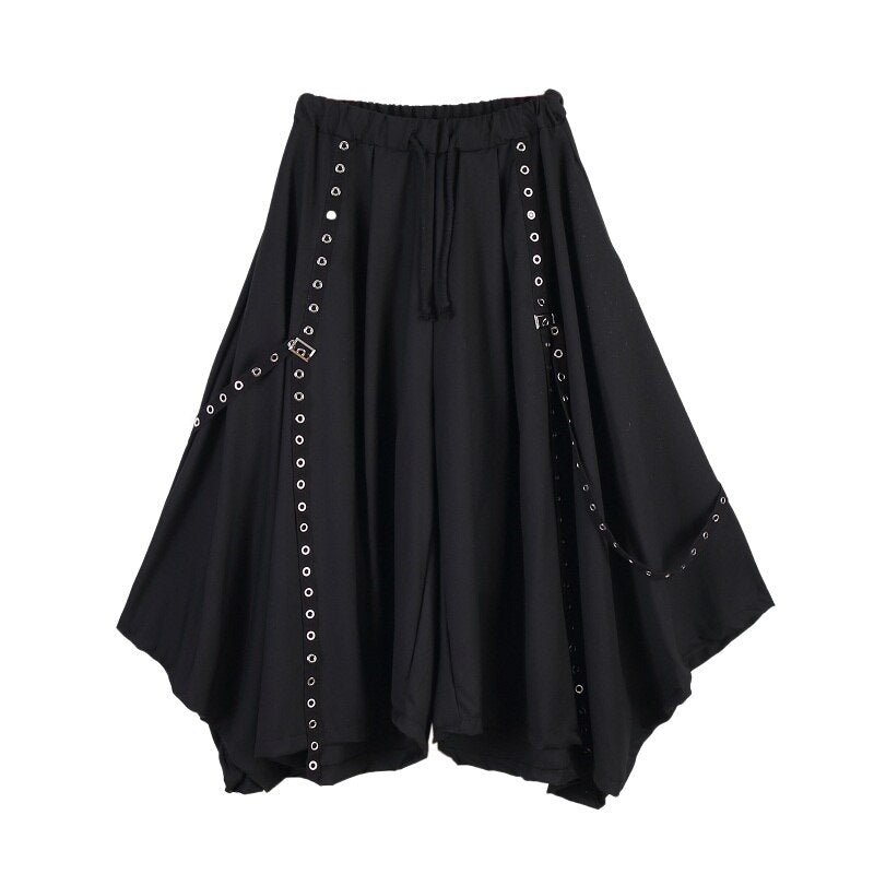 A wide-leg trouser base sits beneath the layered panels, cut with an elastic waistband for an easy, clean top. Hems are neatly finished, hardware is uniform and precise.
