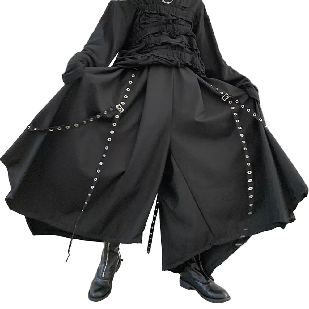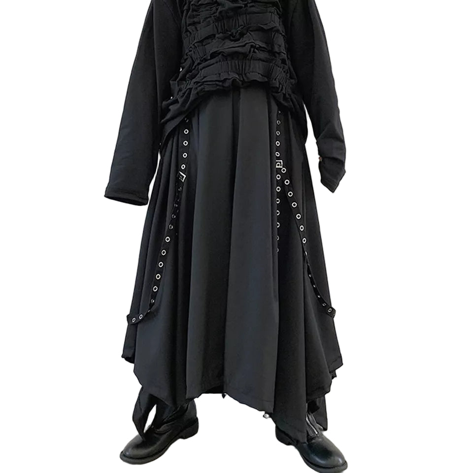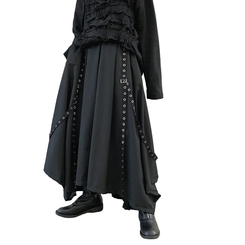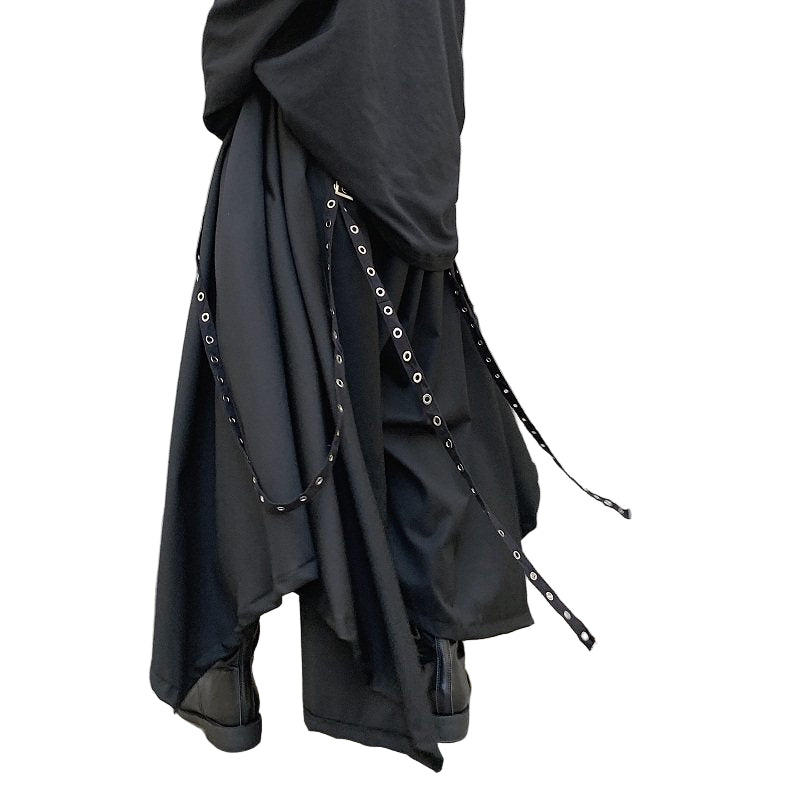Vertical eyelet webbing maps the panels from waist to hem. At each hip, square roller-buckles route long grommet straps that travel across both front and back. Tightened, they gather and lift the drape; released, they swing with measured weight, turning movement into architecture.